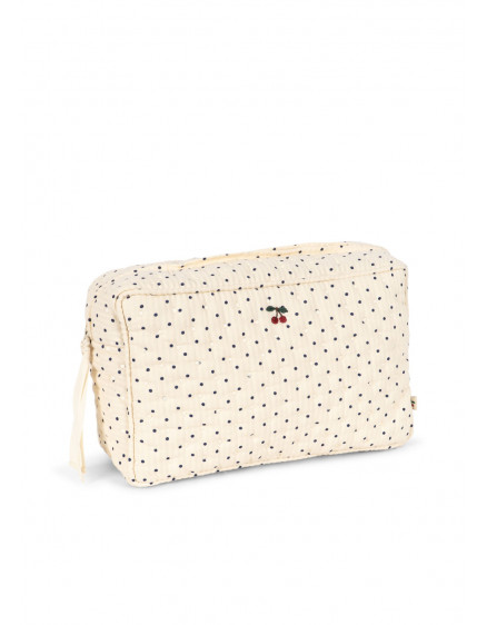 Велика стьобана косметичка з органічної бавовни. Має одне велике відділення та одну меншу внутрішню кишеню. М'яка підкладка для безпечного зберігання ваших необхідних речей. Закривається на зручну блискавку. Розміри: В: 29 см x Ш: 18,5 см x Д: 11,5 см