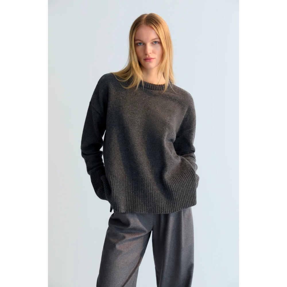 Розкішний, м'який кашеміровий светр із класичним круглим вирізом горловини та широкою ребристою окантовкою на манжетах і подолу для комфортної та структурованої посадки. Тонкі бічні розрізи додають свободи рухів та вільного силуету, що робить його ідеальним для носіння як нашаруванням, так і окремо для створення безтурботно елегантного образу.
