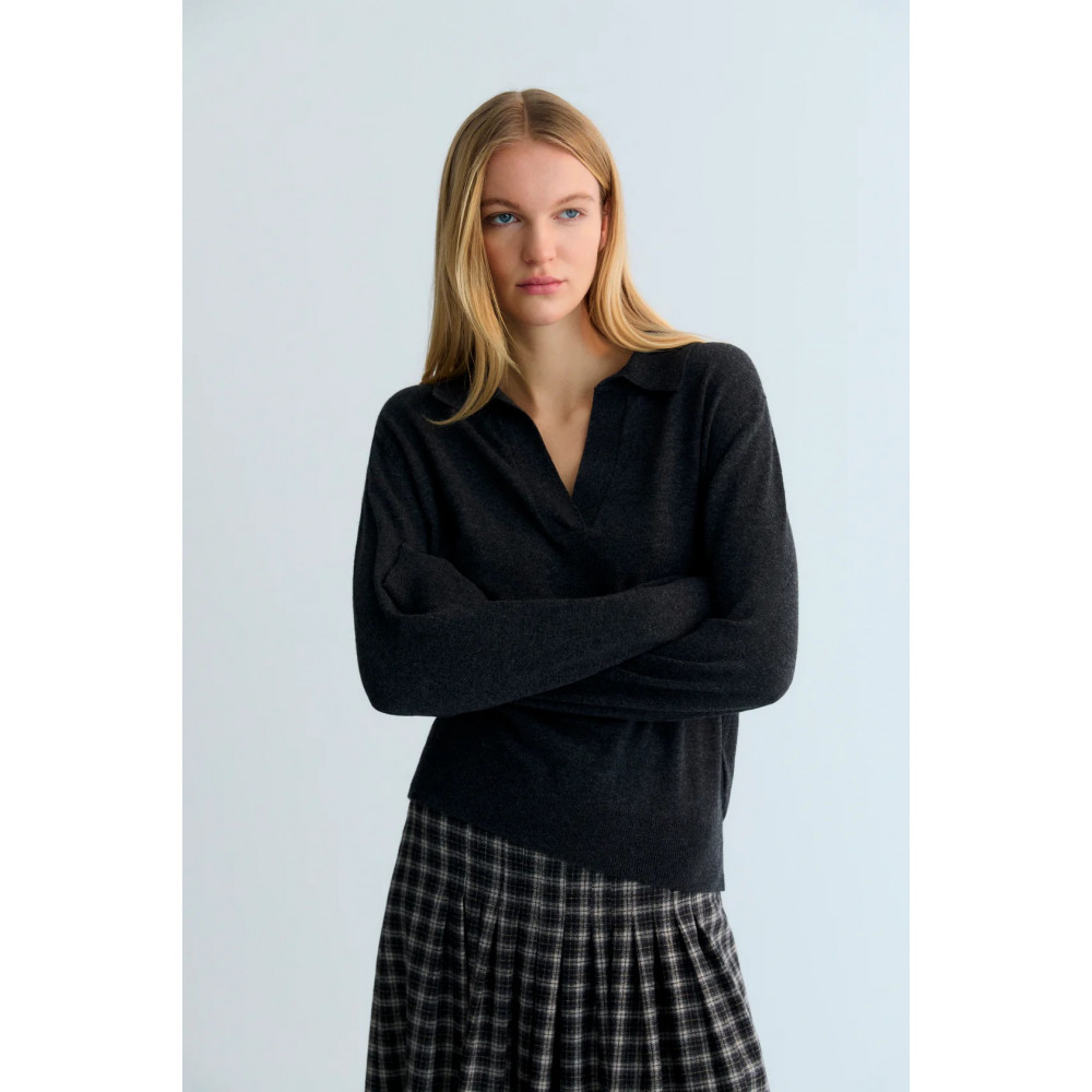 Ця позачасова футболка-поло тонкої в'язки виготовлена з розкішної суміші кашеміру та вовни. Має ребристий комір і планку на ґудзиках, а ребристі манжети та низ забезпечують вишукану посадку. М'яка, легка та універсальна, вона поєднує в собі комфорт та вишуканість.
