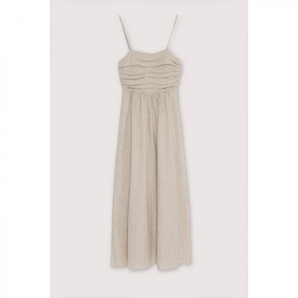 Жіноча сукня Anna виготовлена зі 100% льону, забезпечує дихаючу та легку елегантність. Розроблений з витонченими лямками-спагетті, він має гарну плісировану панель на ліфі, яка підкреслює його вишуканий силует. Струхлива, об’ємна довга спідниця додає руху та витонченості, роблячи її вічним предметом для будь-якого випадку. Ідеально підходить для теплих днів і витонченого стилю, ця сукня поєднує в собі комфорт, жіночність і природну витонченість.
