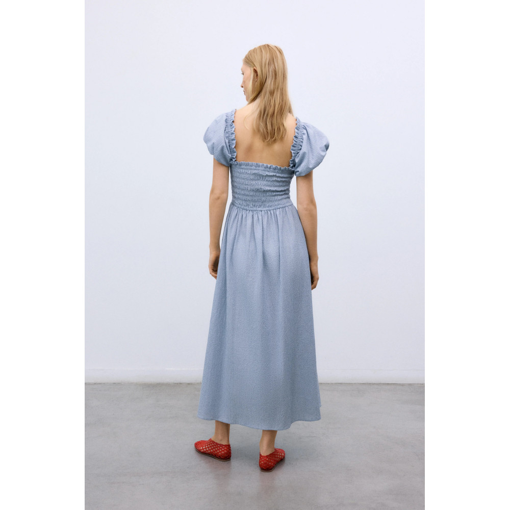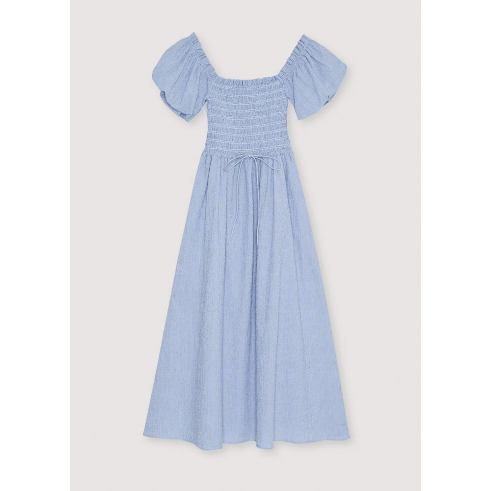 Один з наших найпопулярніших моделей, розроблений для легкого комфорту та жіночного силуету. Сукня має еластичну обробку на грудях з регульованою зав'язкою, що забезпечує гнучку та привабливу посадку. Об'ємні рукави оздоблені еластичними та ніжними рюшами, що додають м'якості рухам та романтичного відтінку. Виготовлено в Португалії з м'якої, дихаючої бавовняної тканини, ідеально підходить для теплих днів та щоденного носіння.
