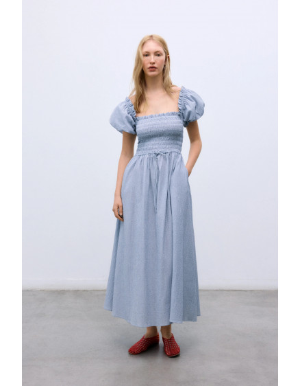 Один з наших найпопулярніших моделей, розроблений для легкого комфорту та жіночного силуету. Сукня має еластичну обробку на грудях з регульованою зав'язкою, що забезпечує гнучку та привабливу посадку. Об'ємні рукави оздоблені еластичними та ніжними рюшами, що додають м'якості рухам та романтичного відтінку. Виготовлено в Португалії з м'якої, дихаючої бавовняної тканини, ідеально підходить для теплих днів та щоденного носіння.