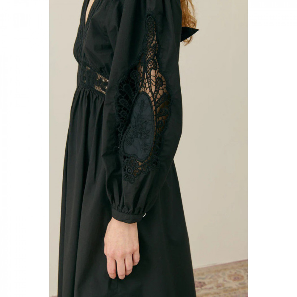 Довга сукня з однотонного бавовняного попліну. Глибокий V-подібний виріз з інкрустованими мереживними деталями. Рукава буфи з ажурним мереживом і манжети на ґудзиках. Приталена талія з інкрустованим мереживом. Оголена спина з бантом посередині, на рівні бюстгальтера. Цей виріб придумала Марі Підансе та її пристрасна команда.