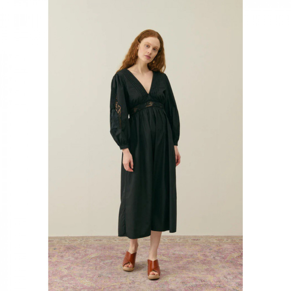 Довга сукня з однотонного бавовняного попліну. Глибокий V-подібний виріз з інкрустованими мереживними деталями. Рукава буфи з ажурним мереживом і манжети на ґудзиках. Приталена талія з інкрустованим мереживом. Оголена спина з бантом посередині, на рівні бюстгальтера. Цей виріб придумала Марі Підансе та її пристрасна команда.
