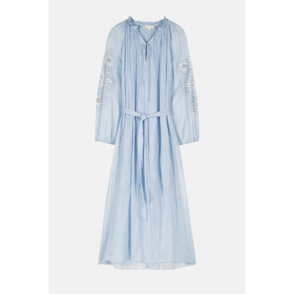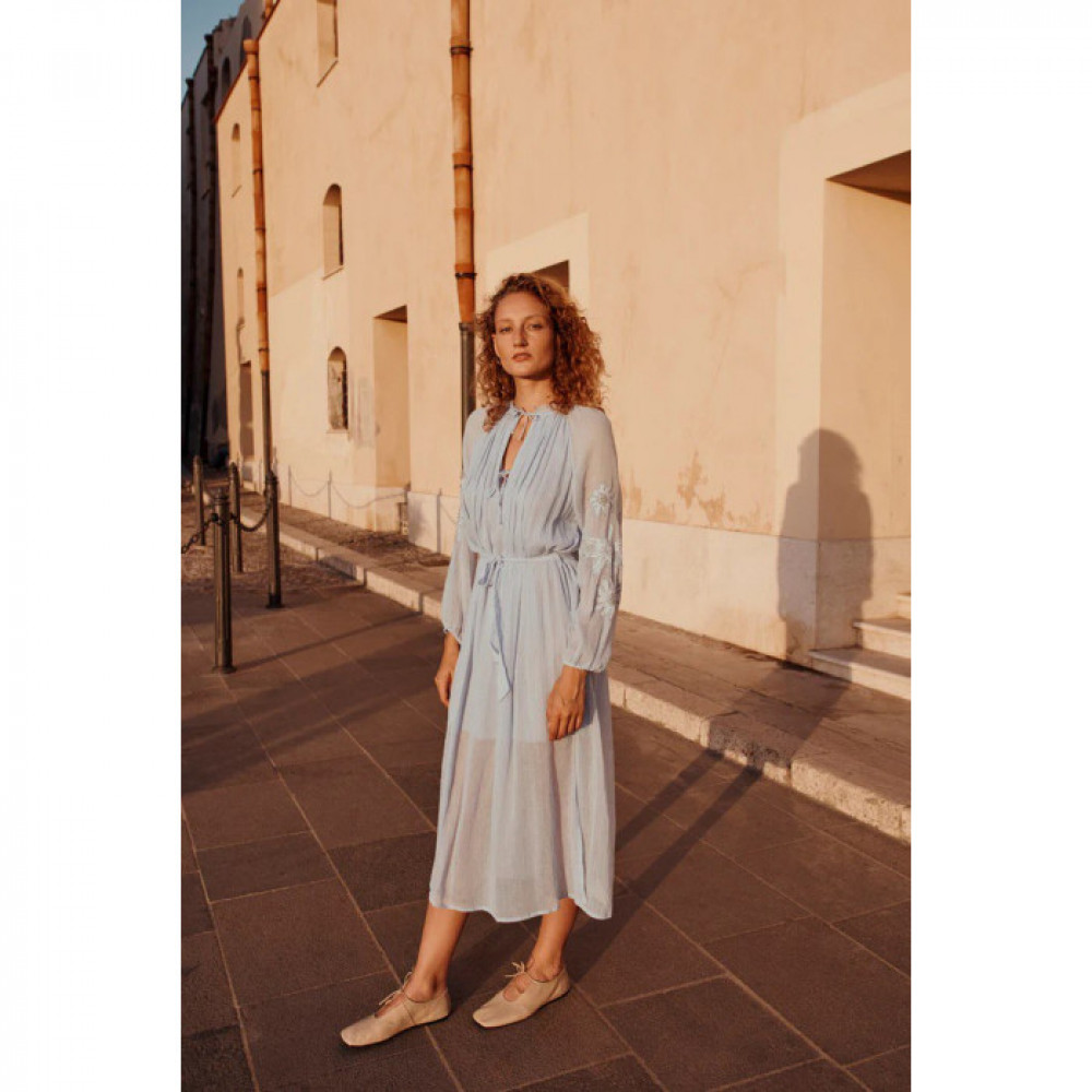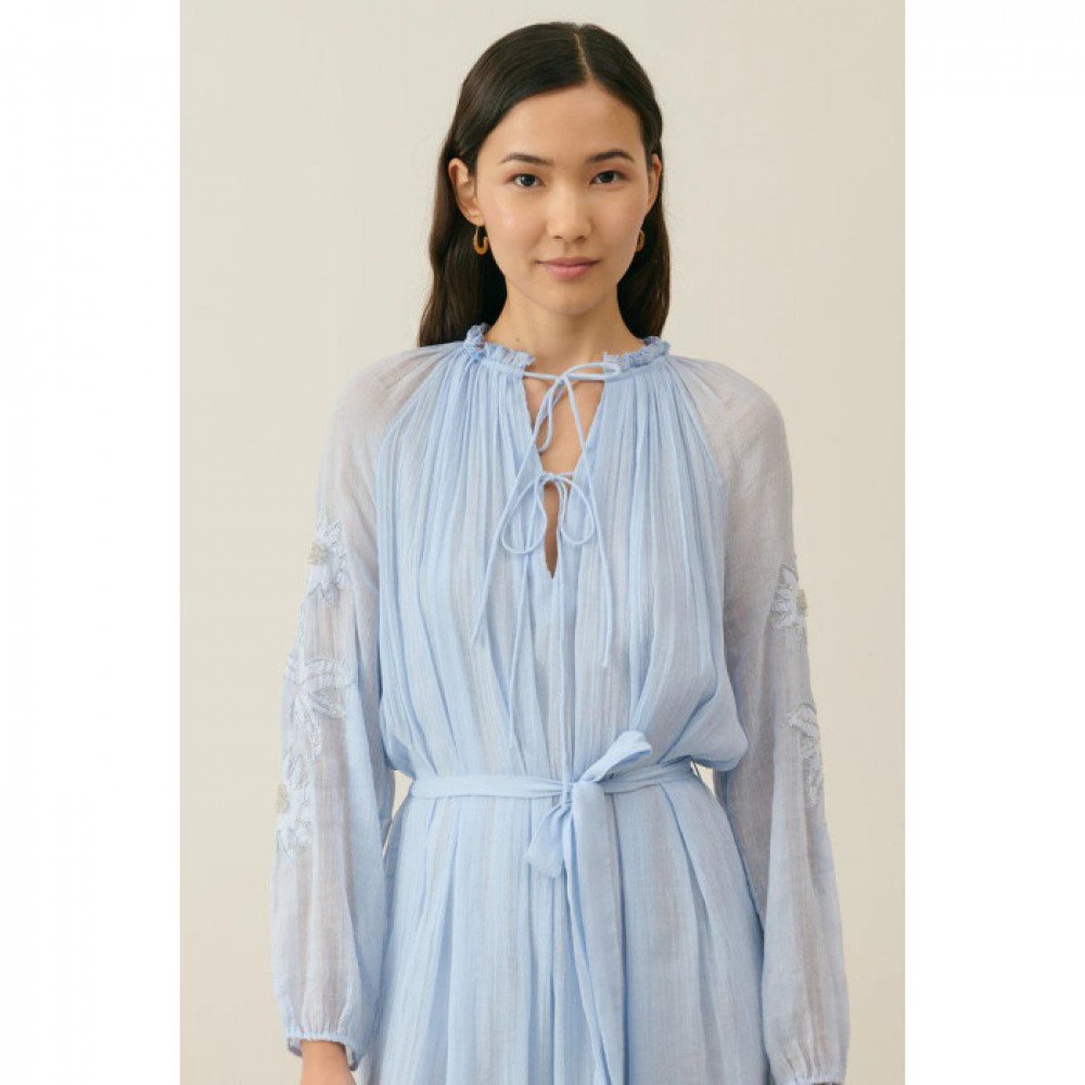 Легка, ніжна бавовняна сукня-вуаль Круглий комір з оборками. Передній розріз із шнурками для зав’язування на двох рівнях. Довгі рукави-буфи з накладними вишивками, вишитими вручну бісером і еластичними манжетами. Тканинні шлевки і пояс. Бічні розрізи. Підкладений.