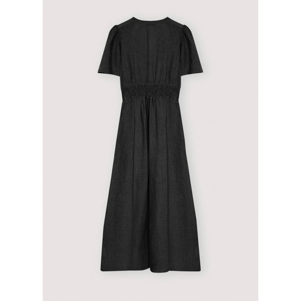 Льняна сукня від The New Society виготовлена у приголомшливому темно-чорному кольорі зі 100% льону для м'якої та повітропроникної посадки. Ця приваблива сукня має V-подібний виріз горловини, короткі рукави з м'якими зборками на плечах та ряд ґудзиків посередині спереду, поєднуючи класичний дизайн із сучасною елегантністю. Ця сукня ідеально підходить для легкого стилю, незалежно від того, чи ви одягаєтеся на захід, чи насолоджуєтеся повсякденним вихідом. Ця сукня є обов'язковим доповненням до вашого гардеробу, втілюючи ідеальний баланс комфорту та вишуканості. Зроблено в Португалії