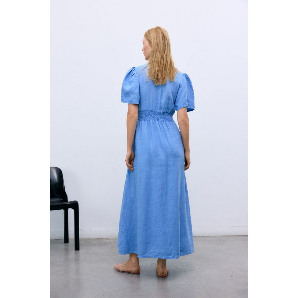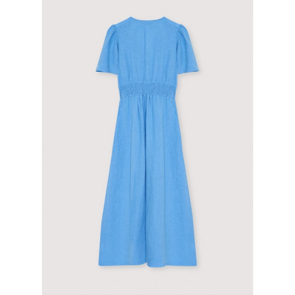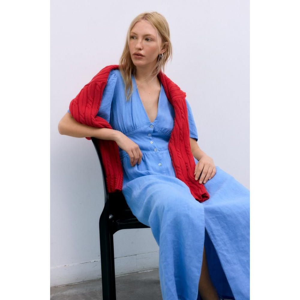 Одна з наших найпопулярніших суконь зі 100% льону, з гарним переднім вирізом з перламутровими ґудзиками та деталлю нагрудного шва. Вона має бічні кишені та облямівку ззаду для кращої посадки на талії.