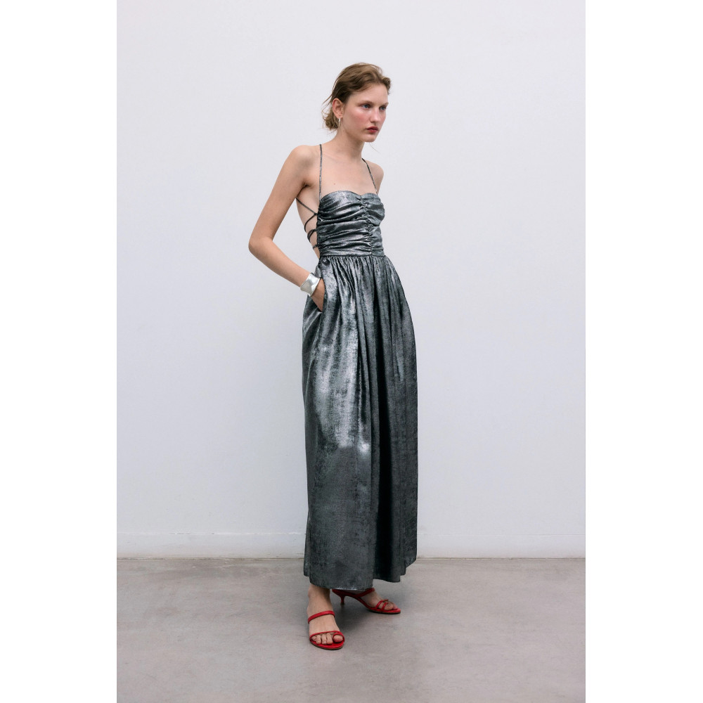 Ефектна сукня, виготовлена з мерехтливої сріблястої тканини, з облягаючою талією та елегантними рюшами спереду для привабливого силуету. Вона має ніжні бретельки-спагеті, що перехрещуються ззаду, та непомітну застібку-блискавку, що поєднує стиль та зручність носіння для створення виразного образу.
