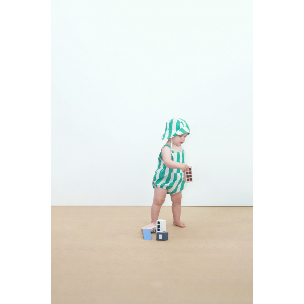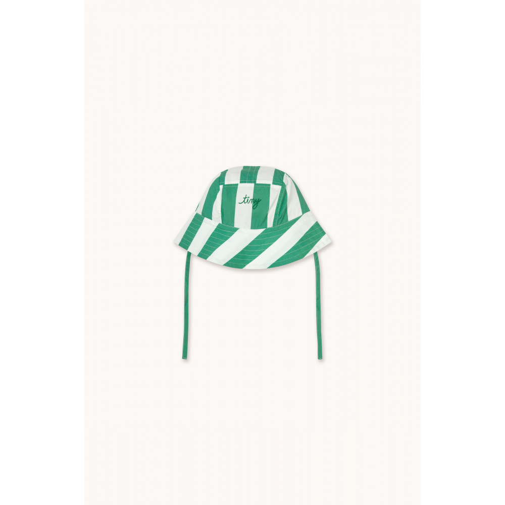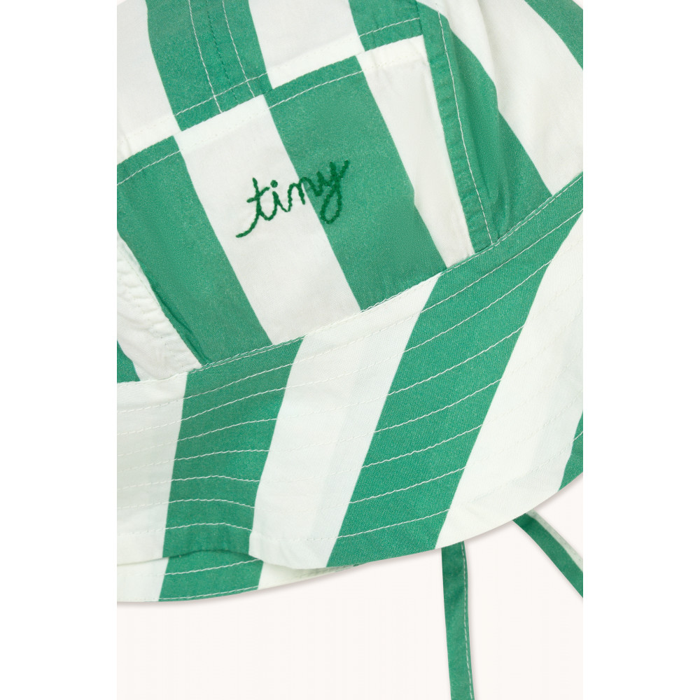 Позачасовий стиль з оригінальною родзинкою. Цей капелюх-відро з принтом «Смарагдові смужки» виготовлений з грайливої тканини Crispy Poplin. Він має невелику ткану етикетку з вишитим логотипом спереду, що додає йому фірмового штриха Tiny. Ідеальний для сонячних днів, цей капелюх чудово поєднує класичний стиль, індивідуальність та функціональність.