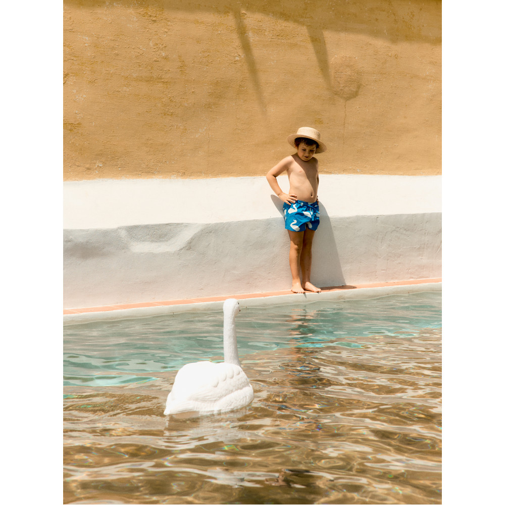 Пориньте у світ веселощів з цими короткими плавками з принтом "Великі лебеді" на синій основі. Виготовлені з міцної, швидковисихаючої тканини, вони мають регульований пояс і шнурок для ідеальної посадки. Зручні, практичні та стильні, вони ідеально підходять для пляжного відпочинку або відпочинку біля басейну.