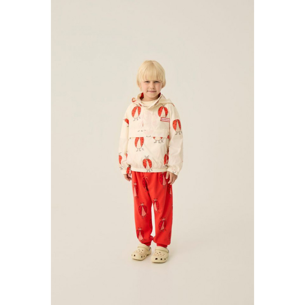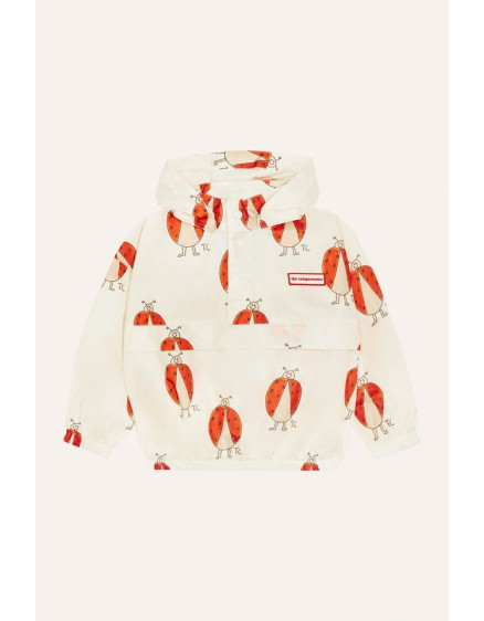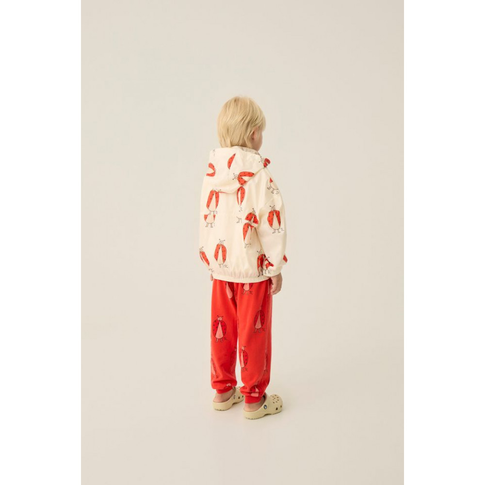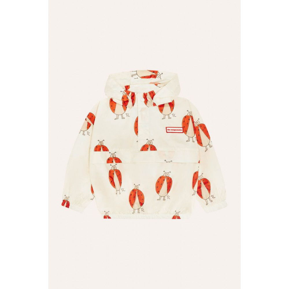 Ця вітровка кольору екрю з крутим принтом сонечок по всій поверхні ідеально підходить для дощових або вітряних літніх днів. Виготовлена з переробленого поліестеру, вона має капюшон і стильну кишеню-кенгуру, щоб можна було зберегти речі або навіть саму куртку.