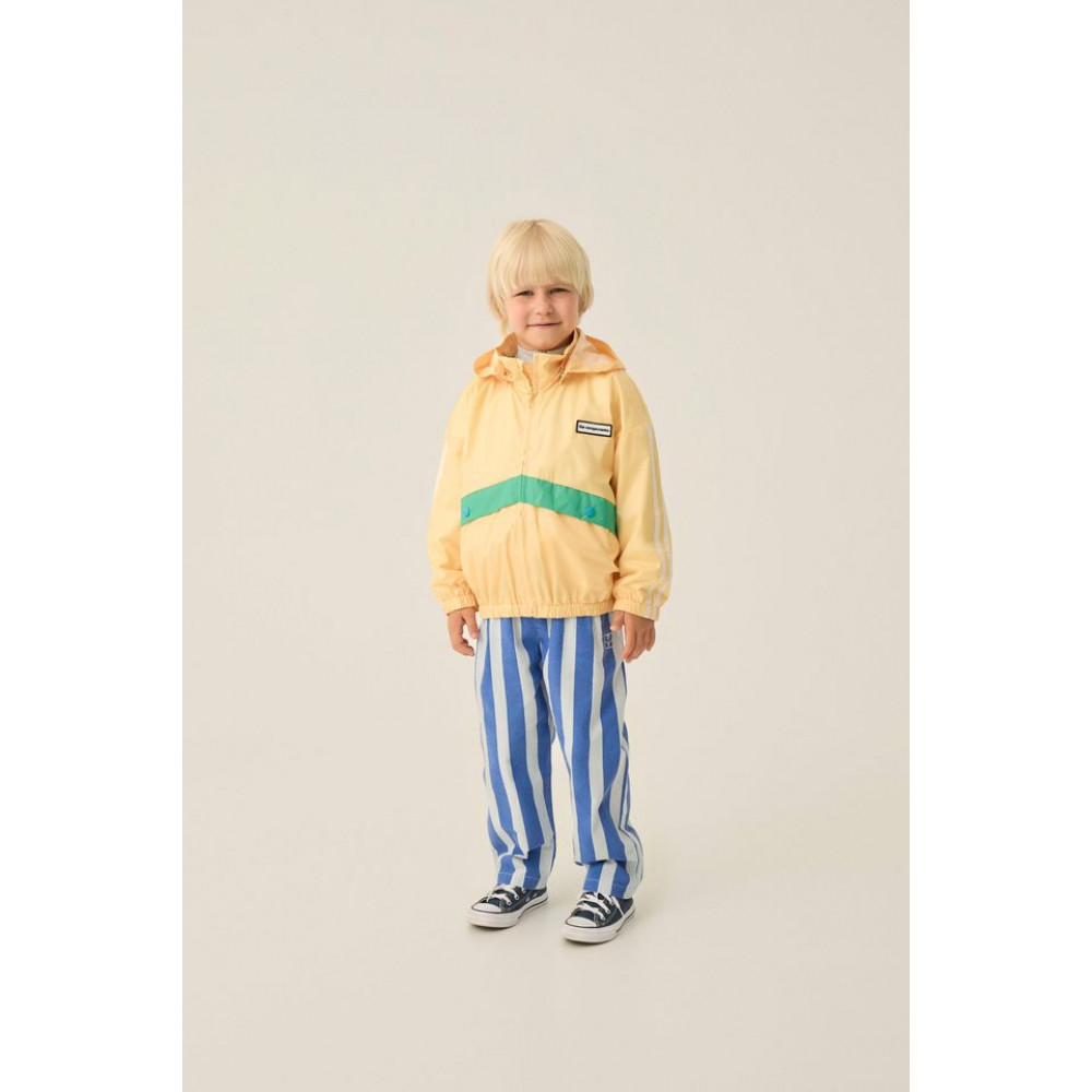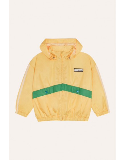 Універсальна куртка, ідеальна для прохолодних літніх днів. Жовтого кольору із зеленими деталями. Виготовлена з переробленого поліестеру та застібається спереду на блискавку. Знімний капюшон.