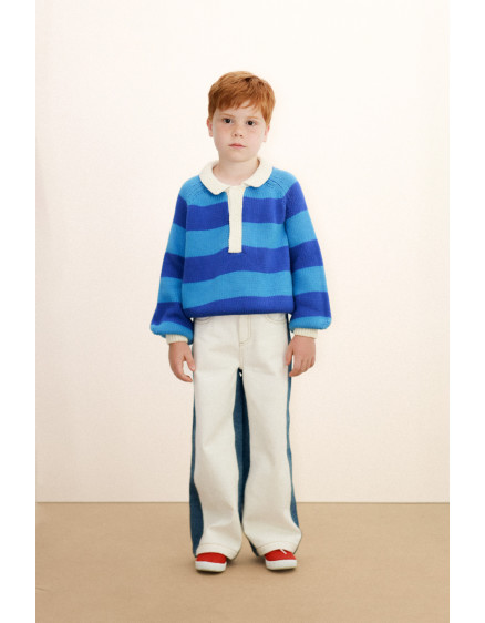 Ці джинсові штани класичного крою поєднують комфорт і стиль у універсальному дизайні. Вони мають брудно-білу основу з боковими вставками з синього деніму, регульований пояс і застібку на кнопки для комфортної та практичної посадки. Контрастна строчка додає свіжості, самобутності, ідеально підходить для повсякденних образів з індивідуальністю.