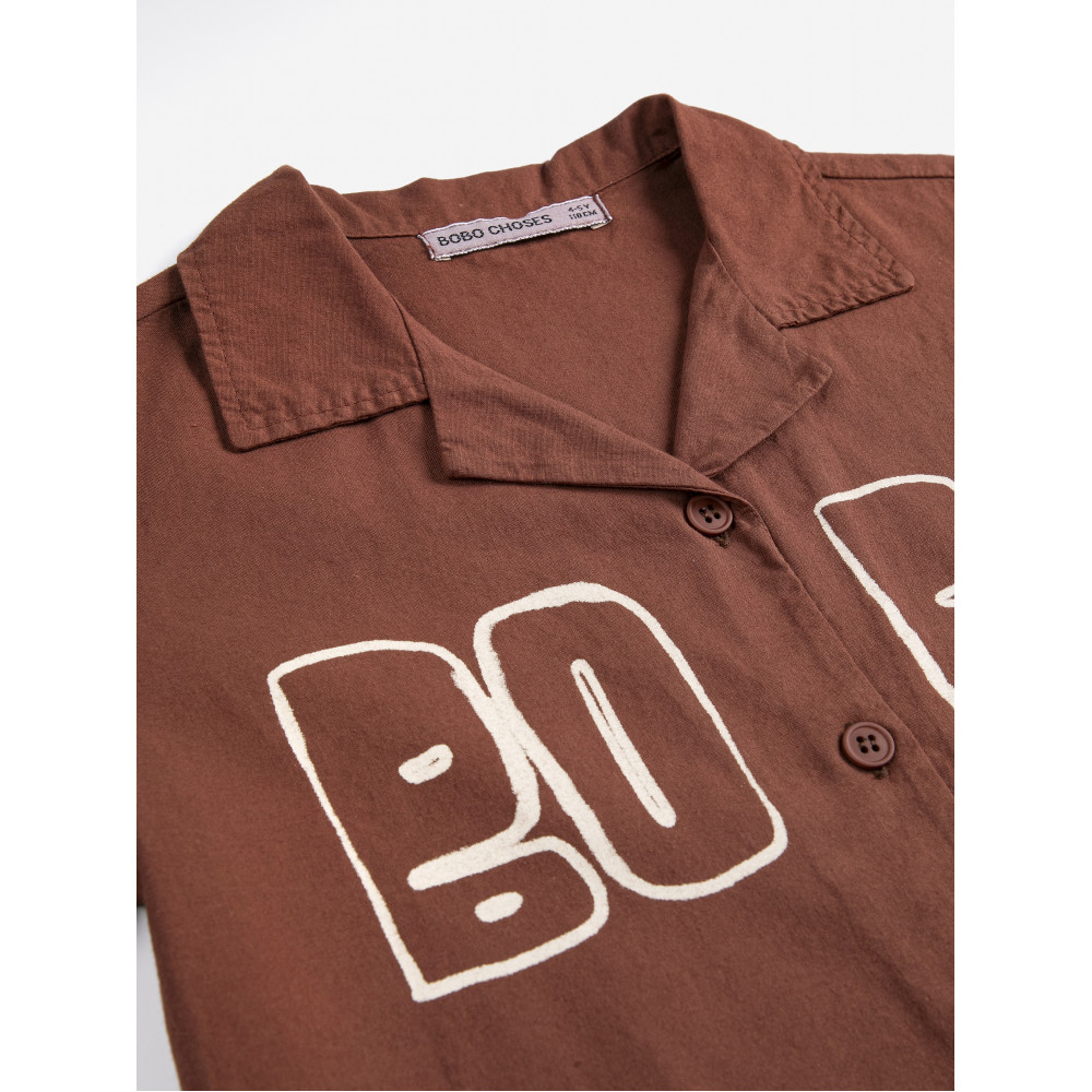 Коричнева сорочка. З приталеним коміром, короткими рукавами, застібкою на ґудзики спереду та вільним кроєм.