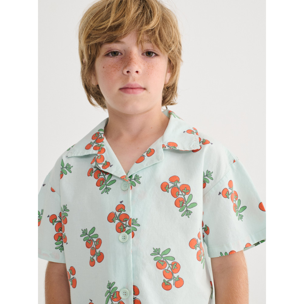 Світло-блакитна сорочка. З приталеним коміром, короткими рукавами, застібкою на ґудзики спереду та вільним кроєм.
