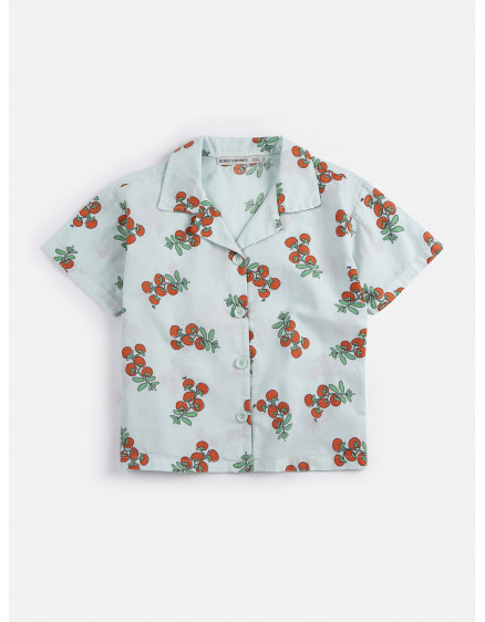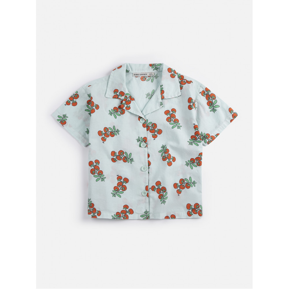 Світло-блакитна сорочка. З приталеним коміром, короткими рукавами, застібкою на ґудзики спереду та вільним кроєм.