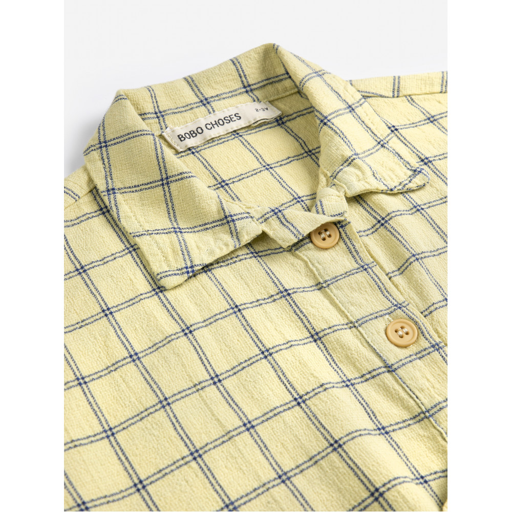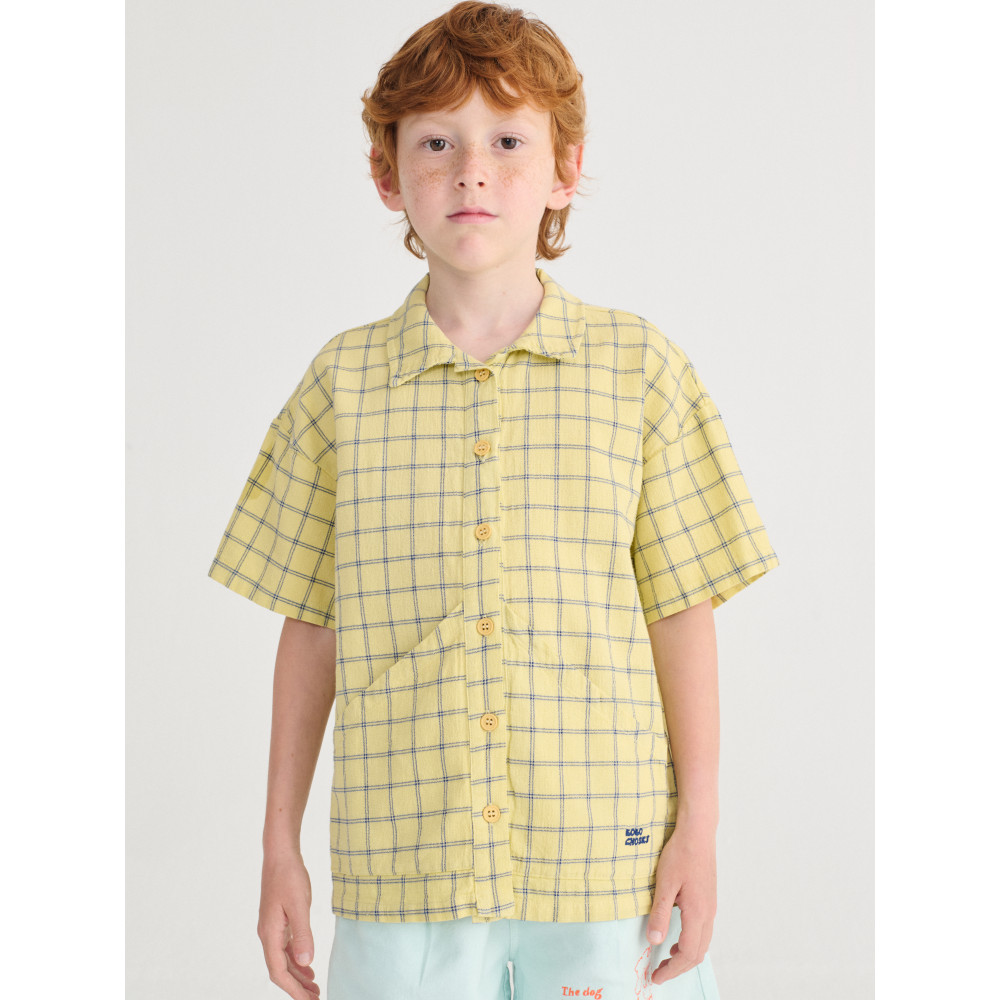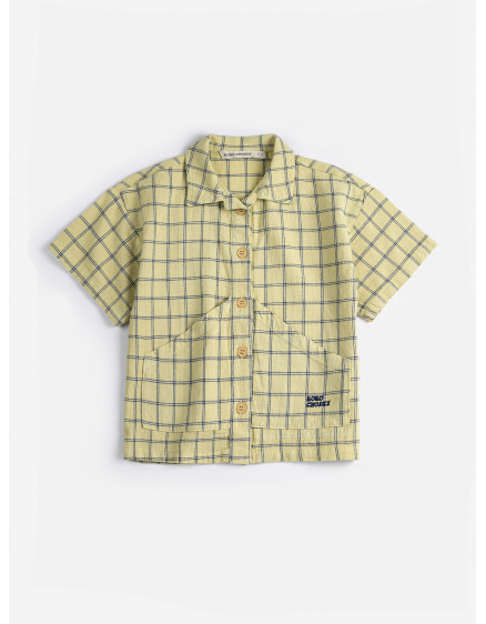 Жовта сорочка. Виготовлена з приталеного коміра, коротких рукавів, застібки на ґудзики спереду, вишивки, вільного крою та накладної кишені.
