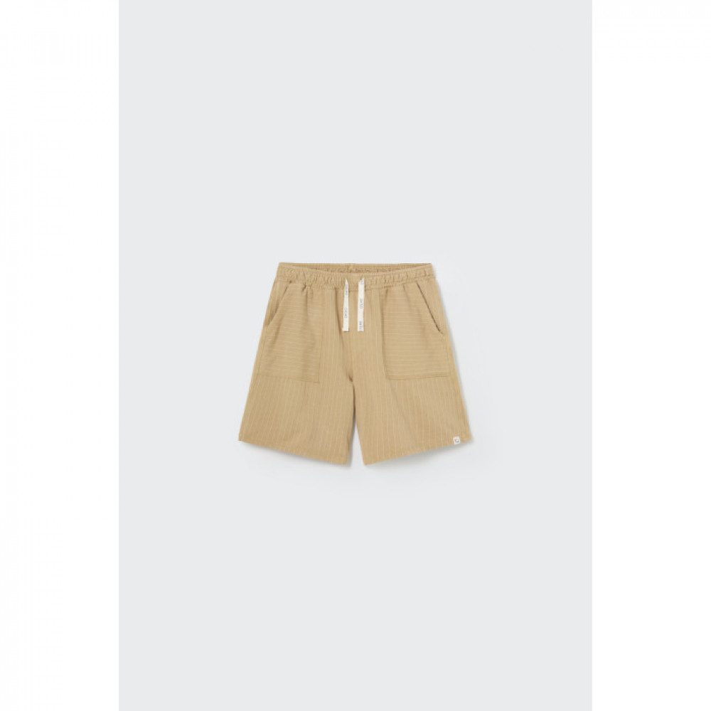 Шорти-бермуди з еластичної та легкої суміші органічної бавовни з жакардовим дизайном. Еластичний пояс з регульованим шнурком.Спереду накладні кишені, ззаду – імітаційні кишені. Контрастні горизонтальні смужки на кишенях.