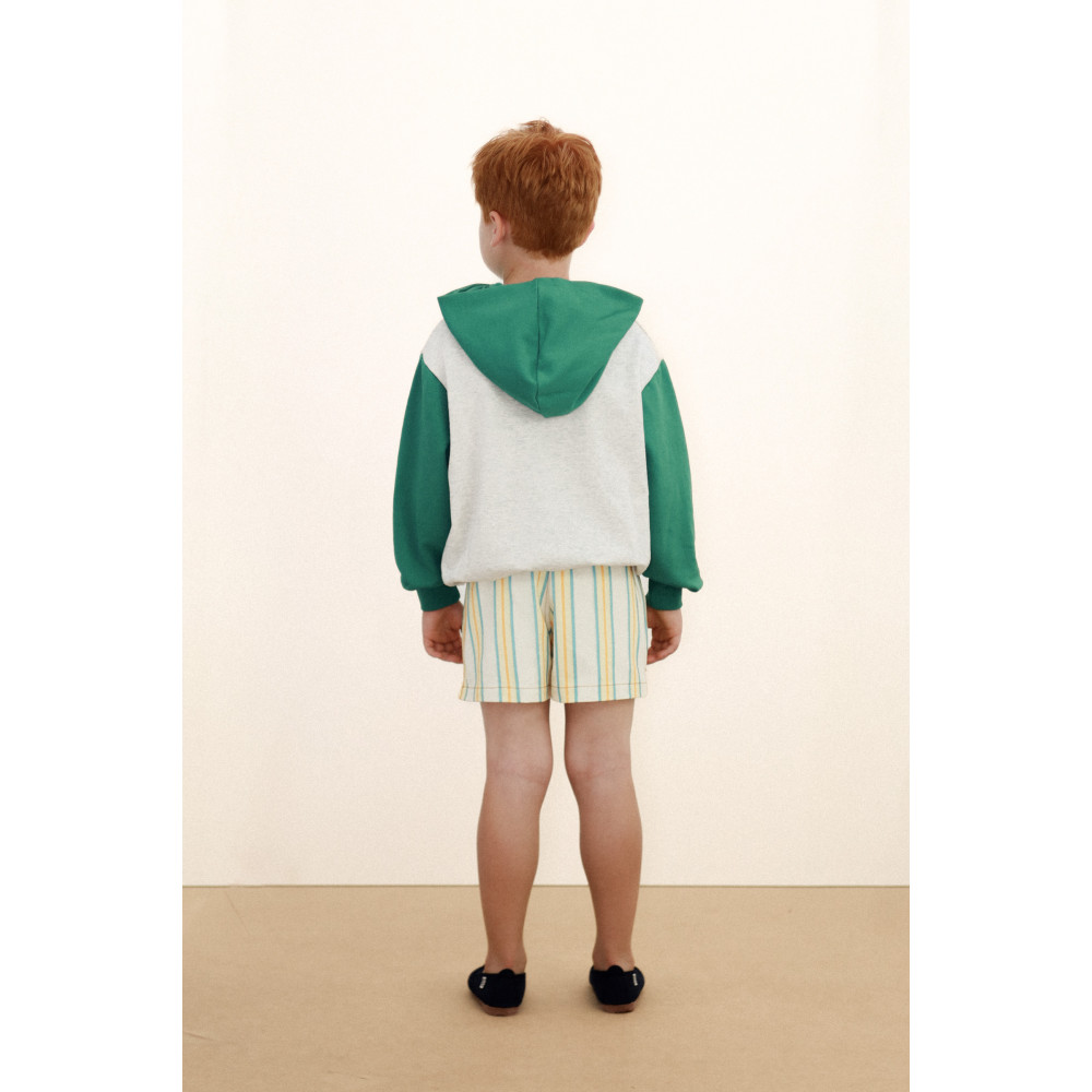 Ці шорти зі 100% бавовни з різнокольоровим смугастим принтом поєднують комфорт, свіжість та стиль у універсальному виробі. Еластичний пояс зі шнурком забезпечує ідеальну посадку, а бічні кишені та невеликі отвори по низу додають функціональності та відчуття розслабленості. Ідеально підходять для насолоди днем з повною свободою рухів.