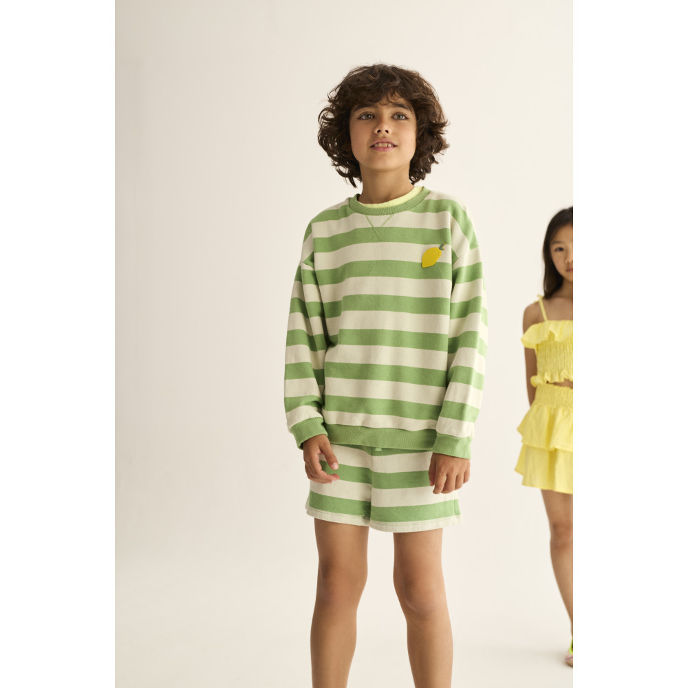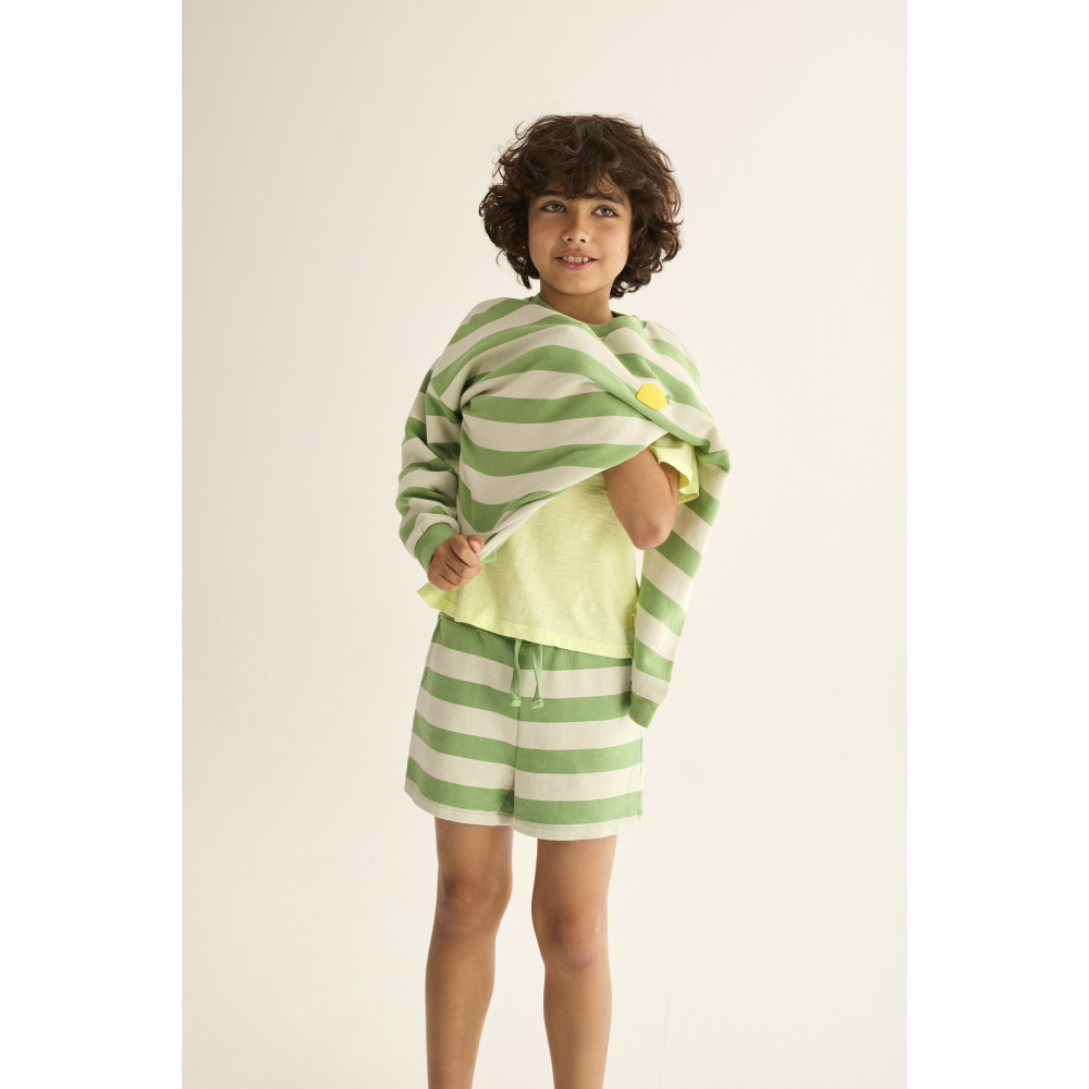 Смугасті шорти з м'якого бавовняного флісу. Еластичний пояс з регульованим шнурком. Бічні кишені.