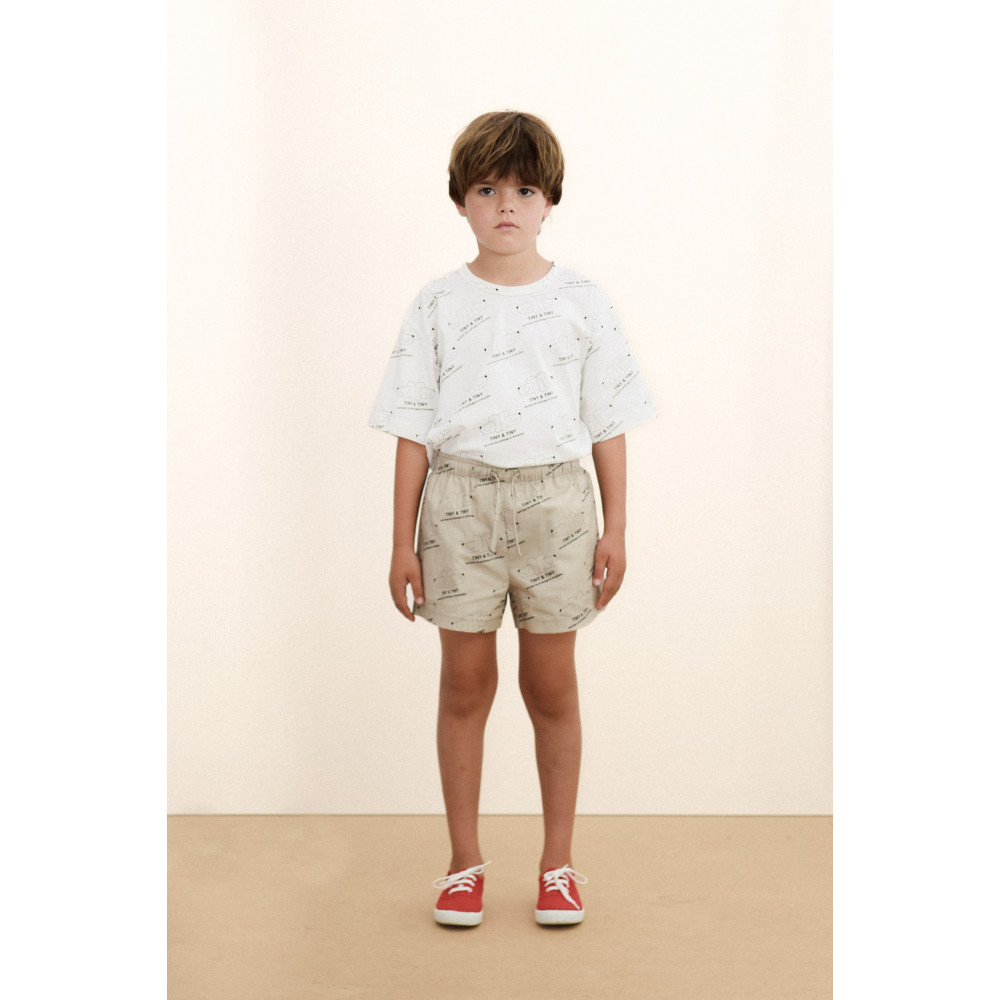 Ці шорти з м’якої саржі з темно-ванільною основою та принтом Tiny & Tiny поєднують стиль та комфорт у універсальному дизайні. Вони мають еластичний пояс із регульованим шнурком для ідеальної посадки та практичні бічні кишені, що доповнюють їхній вільний образ.