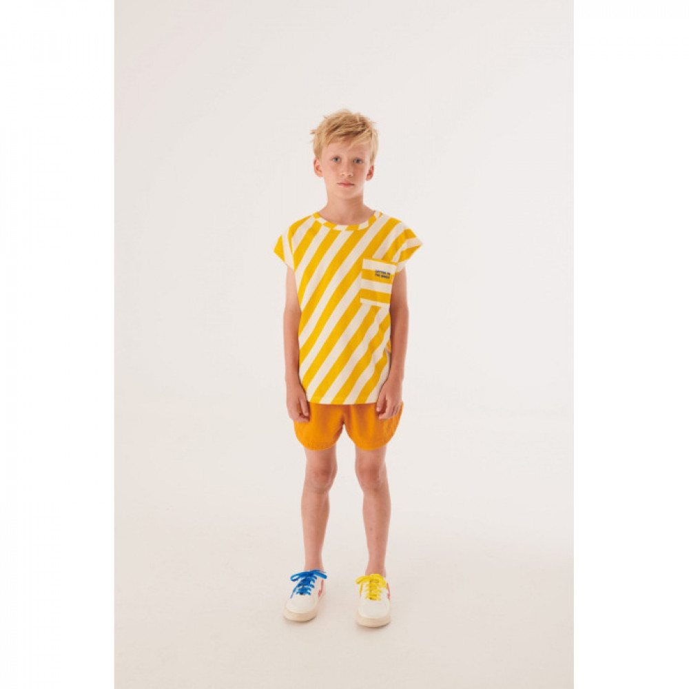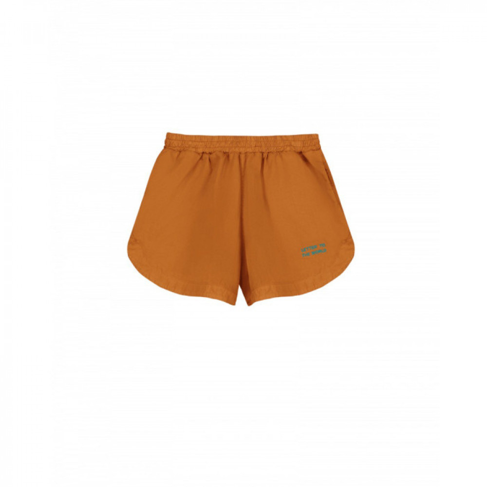 Шорти зі 100% органічної бавовни горіхового кольору. Еластичний пояс і бічні кишені спереду. Прикрашений спереду вишивкою. Вільний крій.