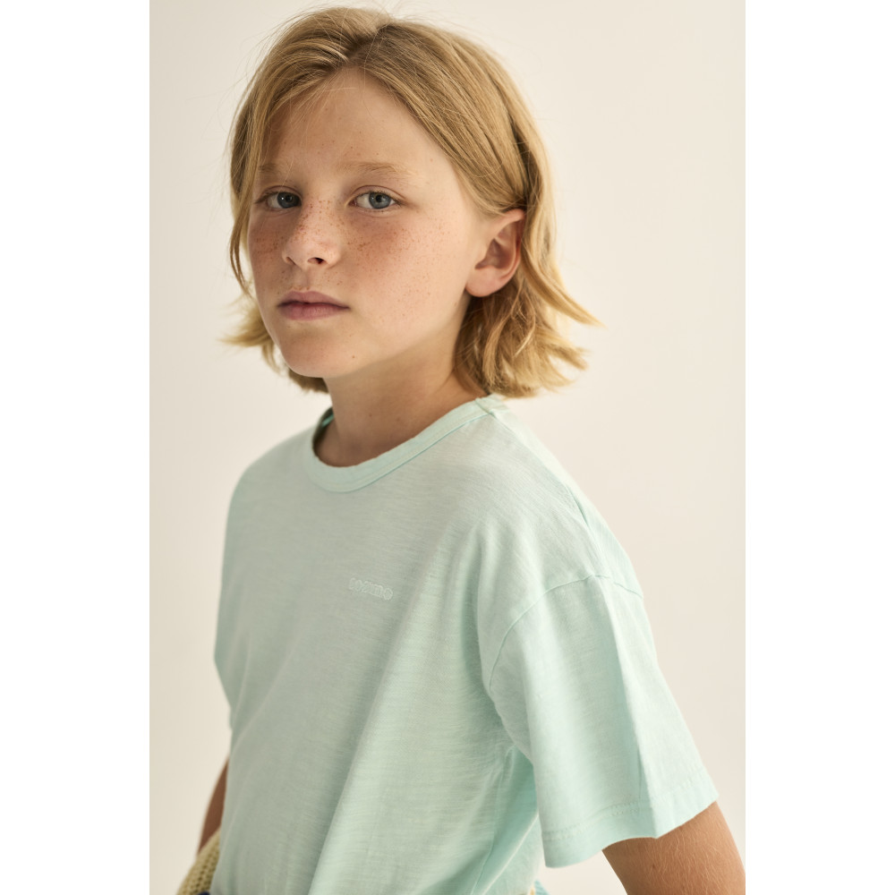Футболка з дуже легкої бавовни. Круглий виріз горловини та застібка на кнопки на лівому плечі. Короткі рукави. Вишивка "Cozmo" на грудях.