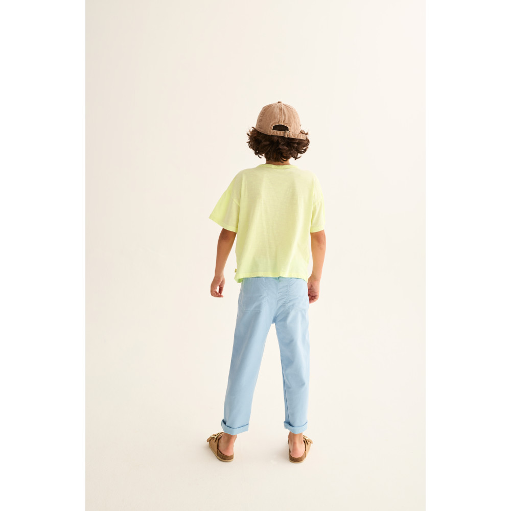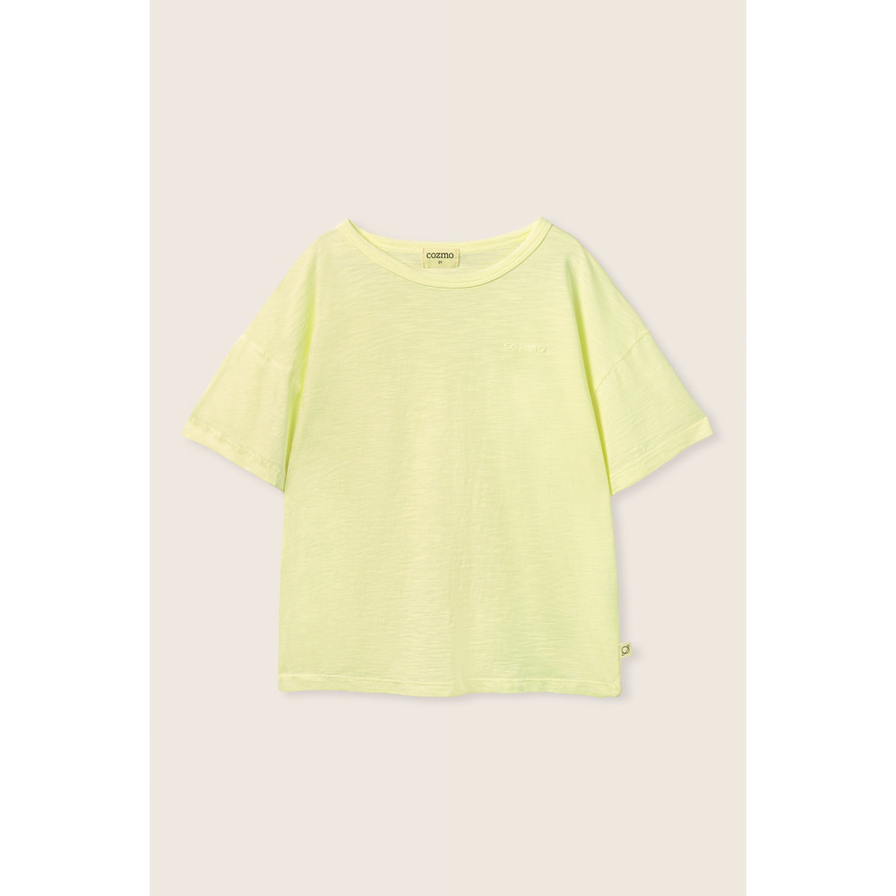 Футболка з дуже легкої бавовни. Круглий виріз горловини та застібка на кнопки на лівому плечі. Короткі рукави. Вишивка "Cozmo" на грудях.