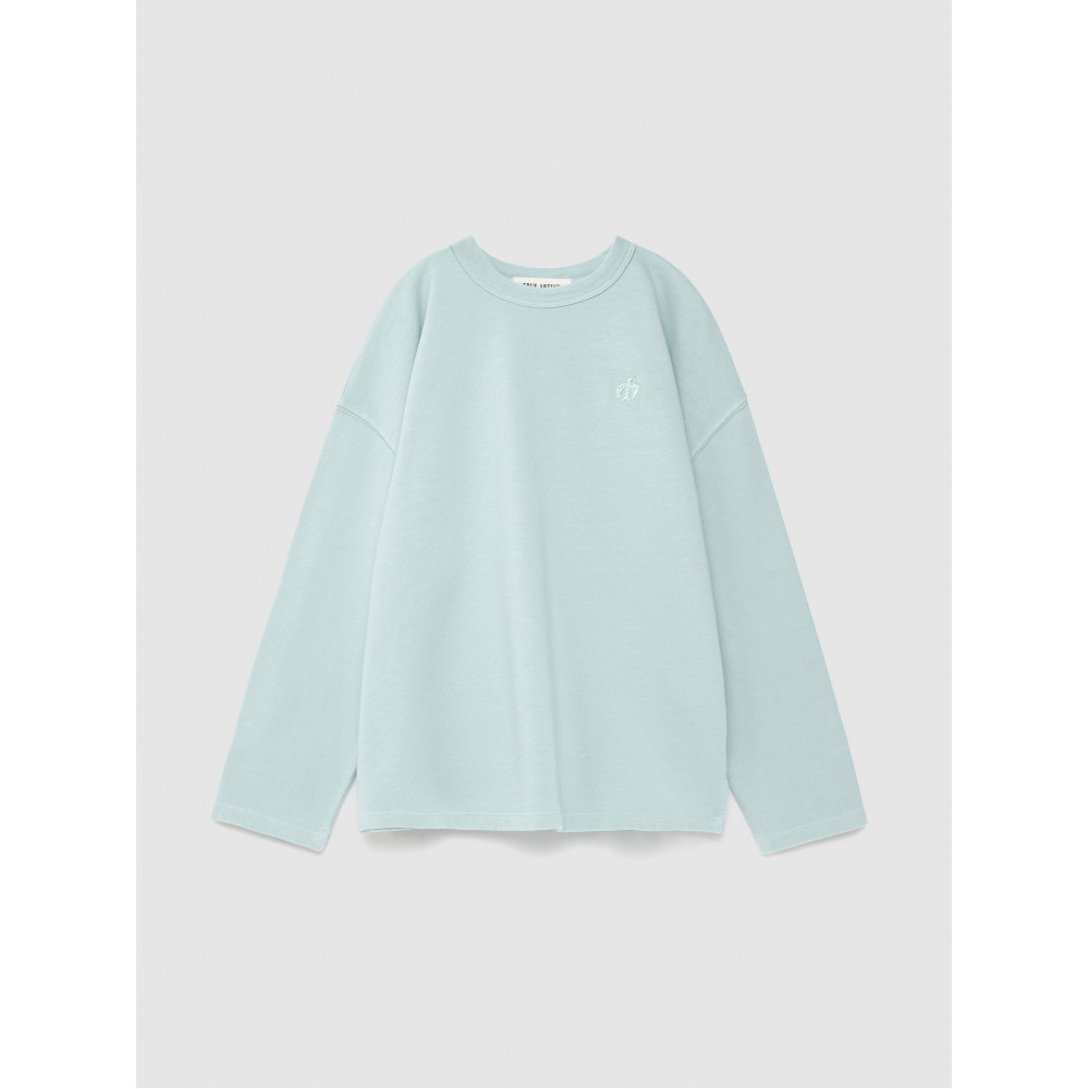 Футболка №02 кольору Glacier виготовлена з щільної в'язки зі 100% органічної бавовни. На грудях вишитий наш логотип із зображенням птаха, а ззаду — сезонний принт «Справжній художник». Вона має круглий комір і довгі рукави. Має вільний крій. Виготовлено в Португалії.