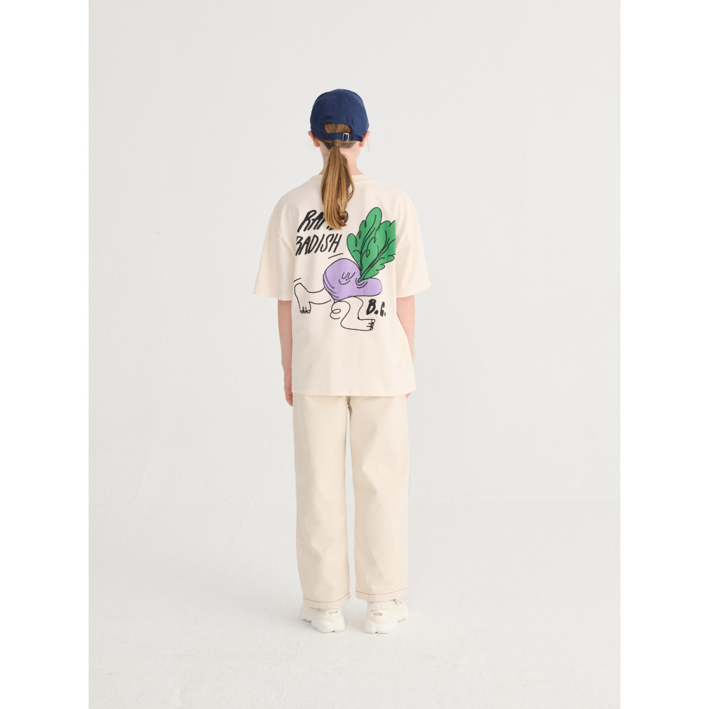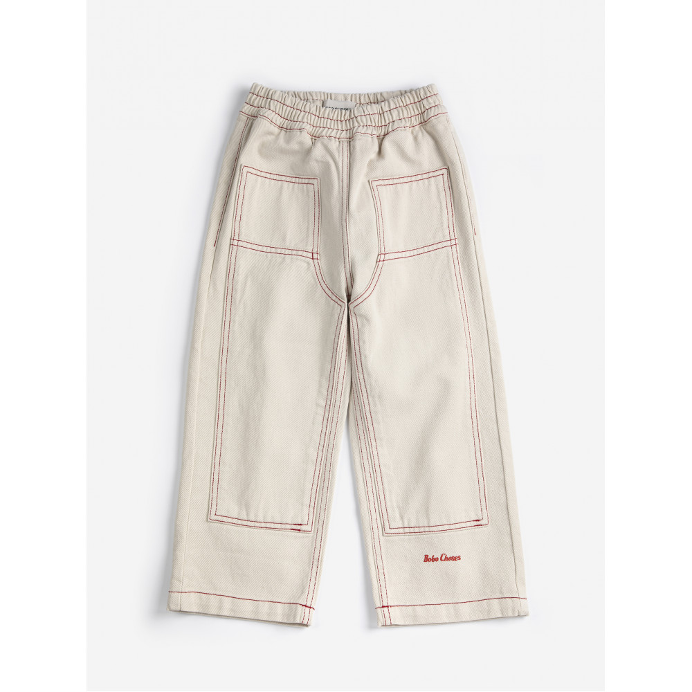 Штани білого кольору. Розроблені з еластичним поясом, бічною кишенею, вишивкою, прямим крійом, регульованим шнурком, подовженою довжиною, накладною кишенею та контрастною строчкою.