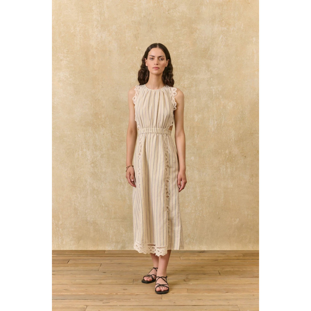 Striped long dress in cotton and linen. Lace details. Zip opening below the waist, at the back.