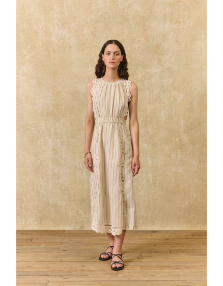 Striped long dress in cotton and linen. Lace details. Zip opening below the waist, at the back.