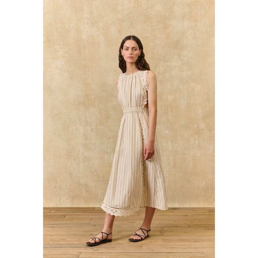 Striped long dress in cotton and linen. Lace details. Zip opening below the waist, at the back.