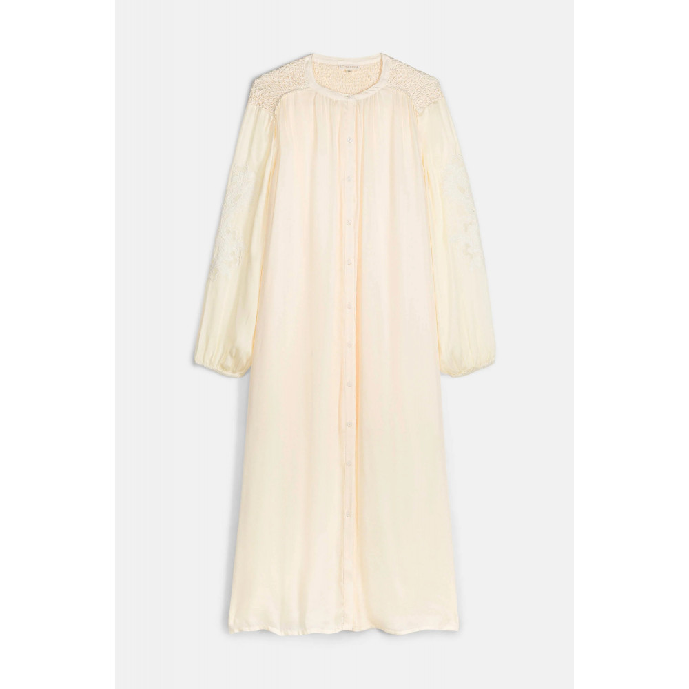 Solid long dress in viscose satin. Round neck. Side slits. Lined. Without belt