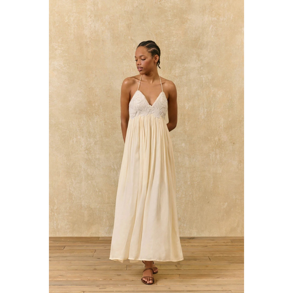 Solid color long dress in viscose satin.