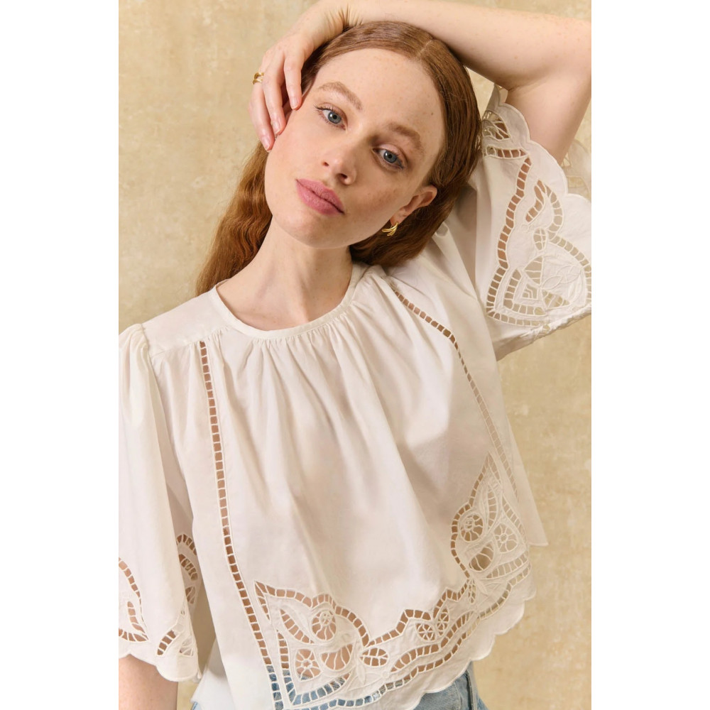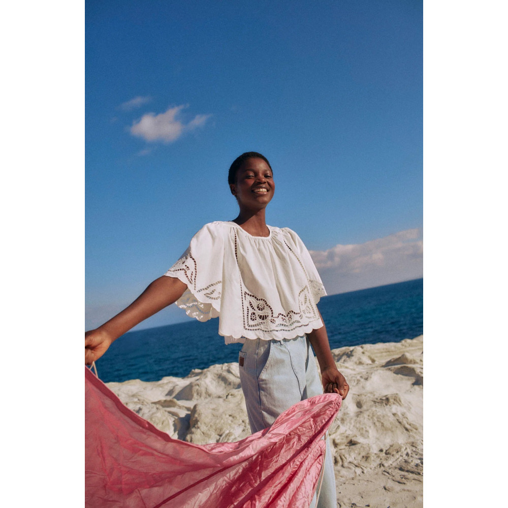 Solid color, cotton popplin crop top with cape-like volume. Gathered round neckline.