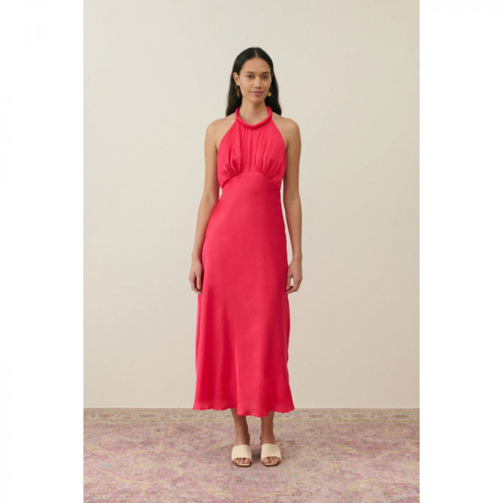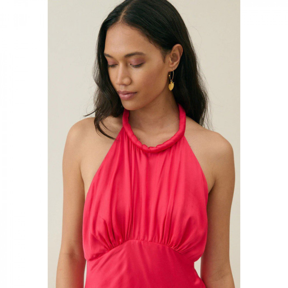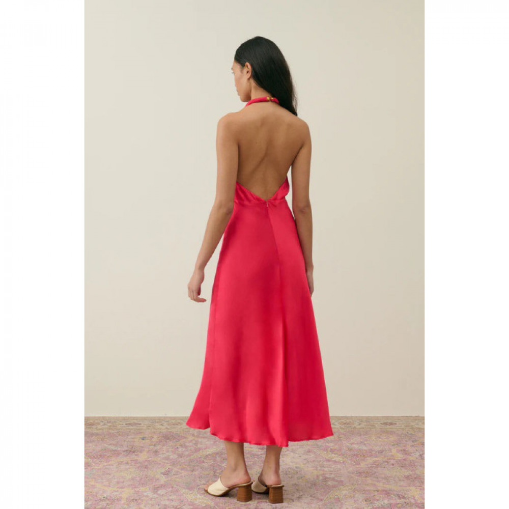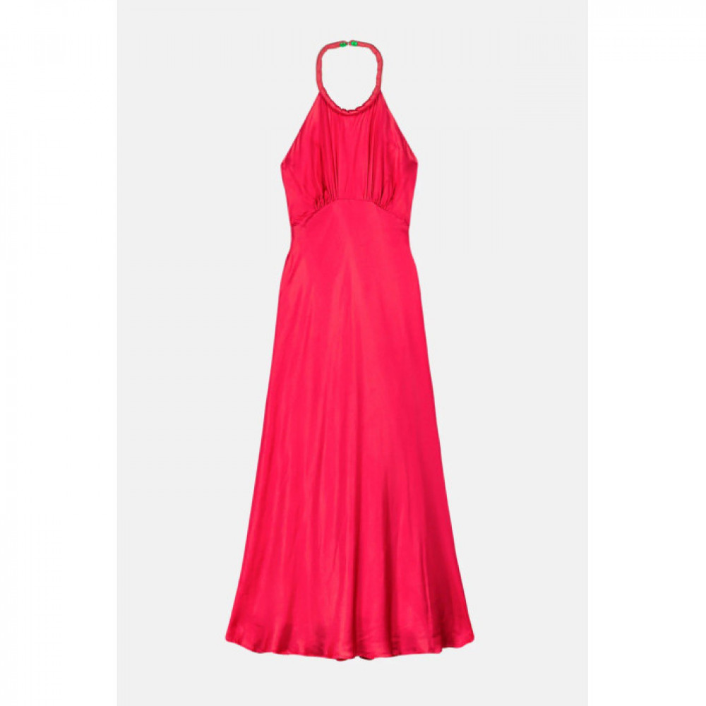 Long dress in solid color viscose satin Rounded crewneck with hand-crafted twists. Bare back. Fastening with gold button at the back. Fitted cut. Back zipper opening. Lined
