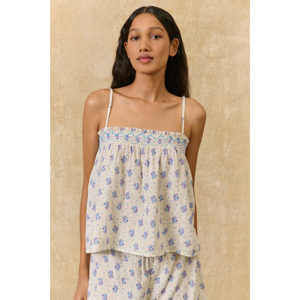 Pajama set with a camisole top and double gauze cotton shorts with Swiss-dot patter.