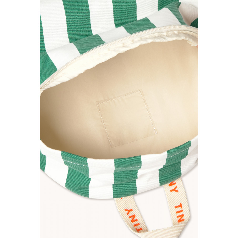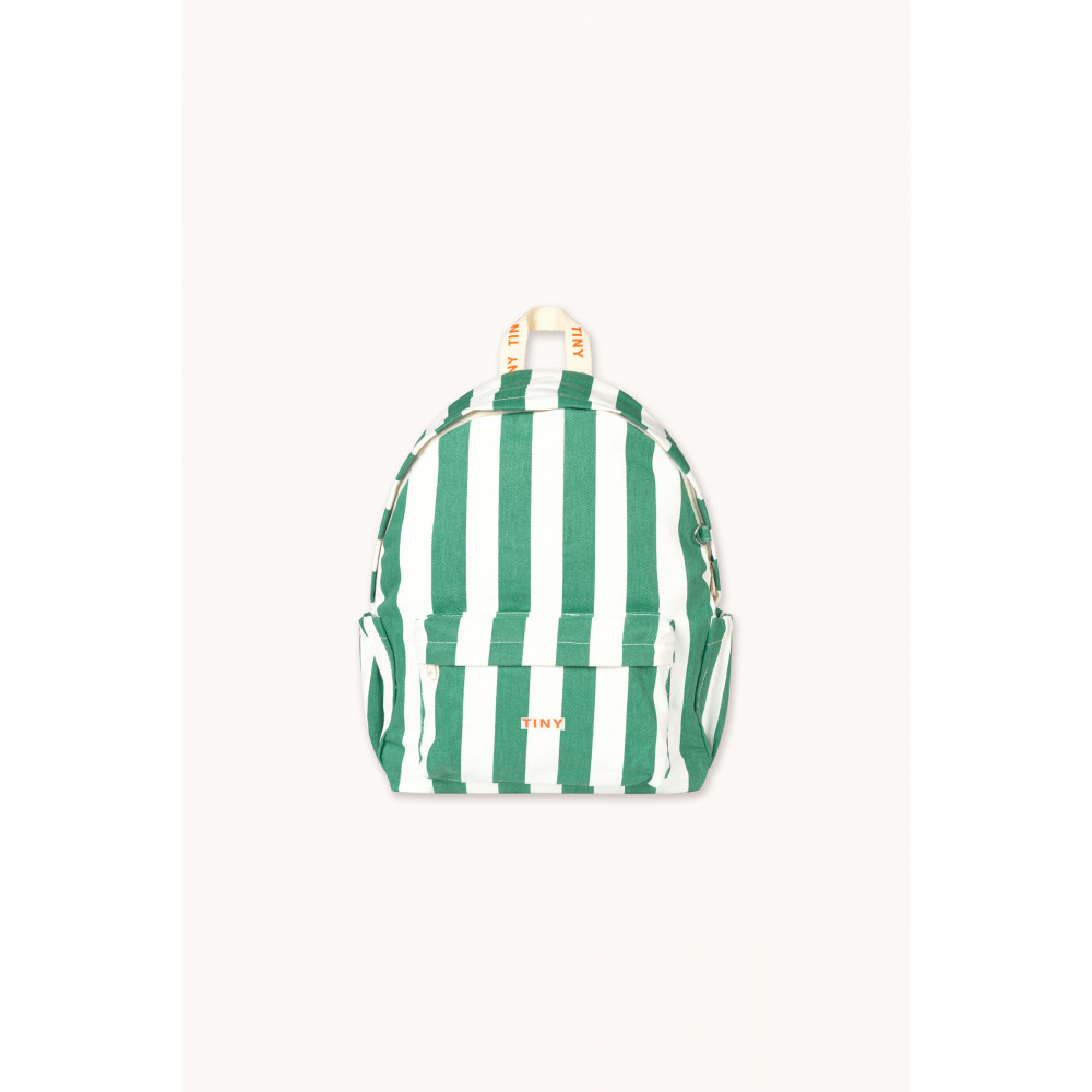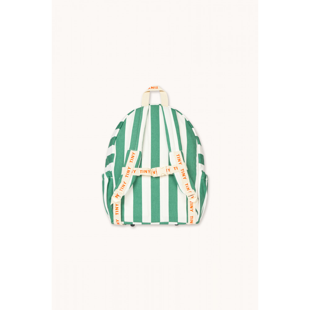 Emerald Stripes School Backpack.This backpack is made from durable fabric featuring the Emerald Stripes Print, combining playful design with practical features. It includes a top handle, padded shoulder straps, and two side pockets for easy storage. The front pocket provides quick access to small items, while the main zippered compartment keeps everything secure.Fully lined and padded on the back and straps, it also features an inner elastic band to hold a water bottle firmly in place. One of the side pockets is insulated to maintain temperature, and the plastic base helps keep the backpack clean when placed on the ground. With a water-resistant finish for extra protection, it’s perfect for school or casual outings. Dimensions: Height 38 cm x Width 30 cm x Depth 14 cm. Do not bleach Do not tumble dry Warm iron on reverse side Do not dry clean