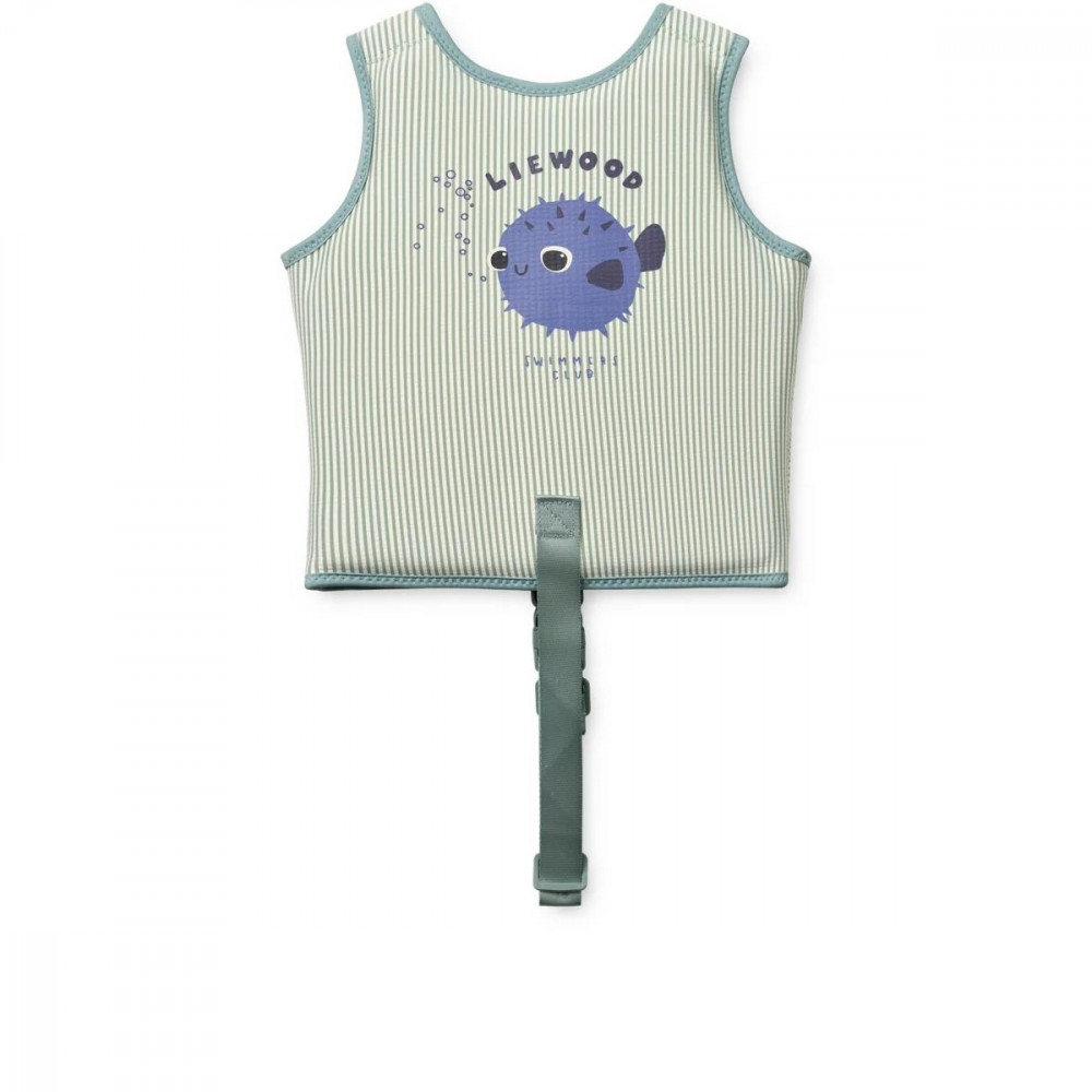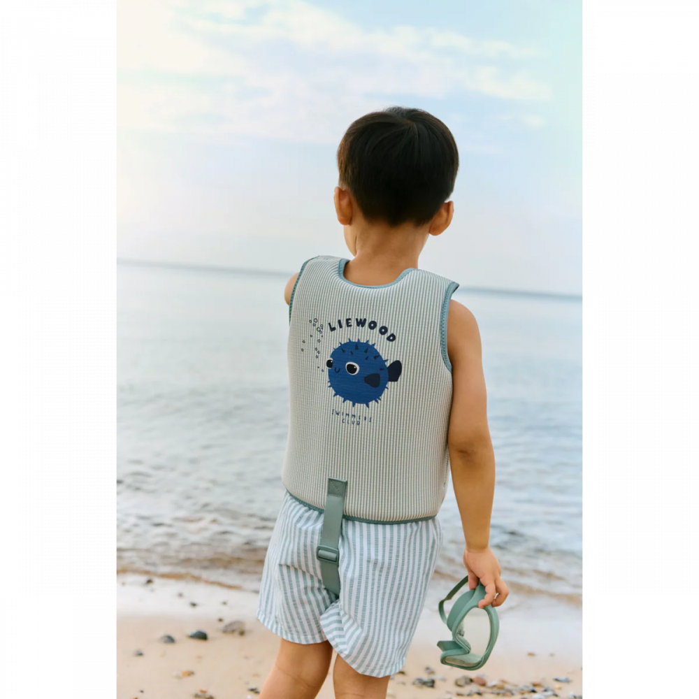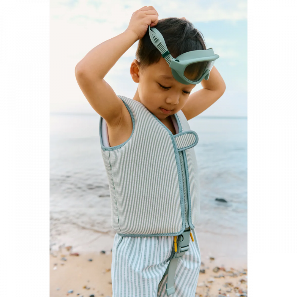 Let eager little swimmers build confidence at their own pace with the family favourite DOVE swim vest. Designed in striped seersucker fabric, it offers gentle buoyancy while allowing mobility to splash and play. The front zip makes it easy to put on, and the safety strap ensures a secure fit. Swim vest with seersucker material with playful stripes and in summery colours The shell is made from 100% soft and quick-drying polyester Light and flexible material allows for full mobility Easy to take on and off with the front zipper Added safety strap for in-between the legs Great swimming aid for gaining confidence in the water Please note that the swim vest should fit snugly around your child's chest to ensure safe buoyancy
