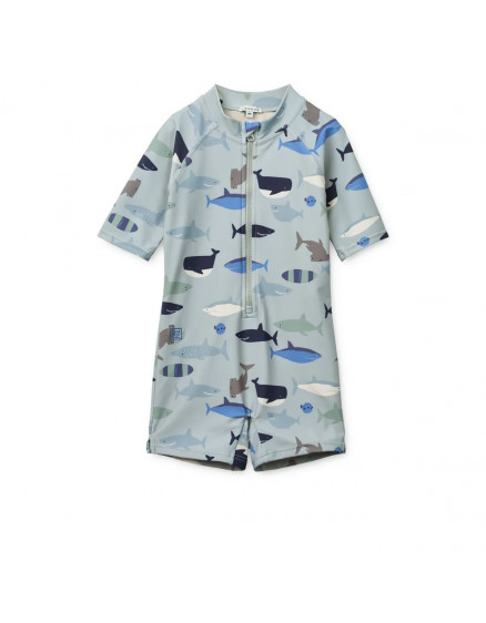 Simple, practical, and made for sunny days, the MAX short-sleeve swim jumpsuit combines a lightweight feel with UV40+ protection. The stretchy, quick-drying material allows freedom to move, and the front zipper makes changing a breeze. Short-sleeved swim jumpsuit with UV40+ protection Made from stretchy and quick-drying fabric This product contains 82% GRS-certified post-consumer recycled polyester The front zipper makes it easy to put on and take off Note that if your little one is between two sizes, we recommend choosing the larger size Comfortable all-day swimwear for sunny adventures by the water