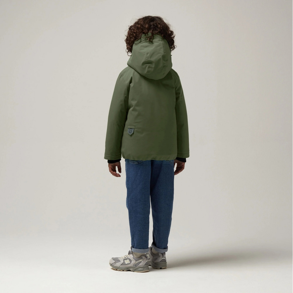 This waterproof jacket falls just over the hip, features double front pockets, a fluffy biodegradable filling and has all the finishes for a bona fide OUTERPROOF. With all seams carefully taped, a waterproof column pressure of 8K and an extra durable water repellent finish CHIPMUNK jacket is not messing around. Waterproof rating: heavy rainfall 8000mm column pressure Taped seams High performance material Dense Micro Twill made out of recycled yarn DWR Bionic finish® Eco; the deep water-repellent component used is based on a fluorine free recipe Reflective safety strip in the small pocket at back of garment All our garments are BPA + AZO free and certified with all child safety regulations No animals are used for these products