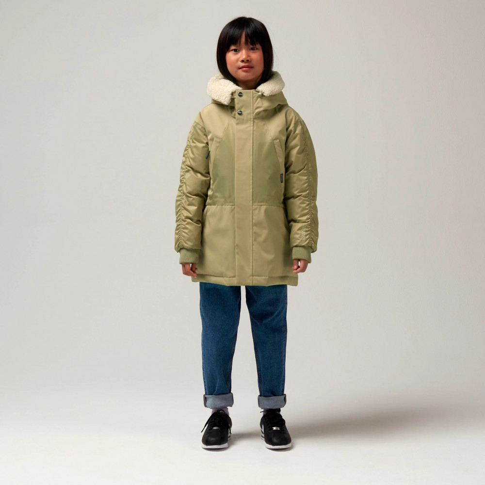 With the FUNNY FROG, your child will be giggling their way through all weather conditions! This funny little guy has a removable faux fur trim to add some extra warmth around the face. The waterproof satin panels and smocked sleeves add and interesting and cool look to the jacket. Waterproof rating: heavy rainfall 8000mm column pressure Taped seams High performance material Dense Micro Twill and Heavy Sateen Recycled yarn for the Dense Micro Twill DWR Bionic finish® Eco; the deep water-repellent component used is based on a fluorine free recipe Reflective safety strip in the small pocket at back of garment All our garments are BPA + AZO free and certified with all child safety regulations No animals are used for these products.