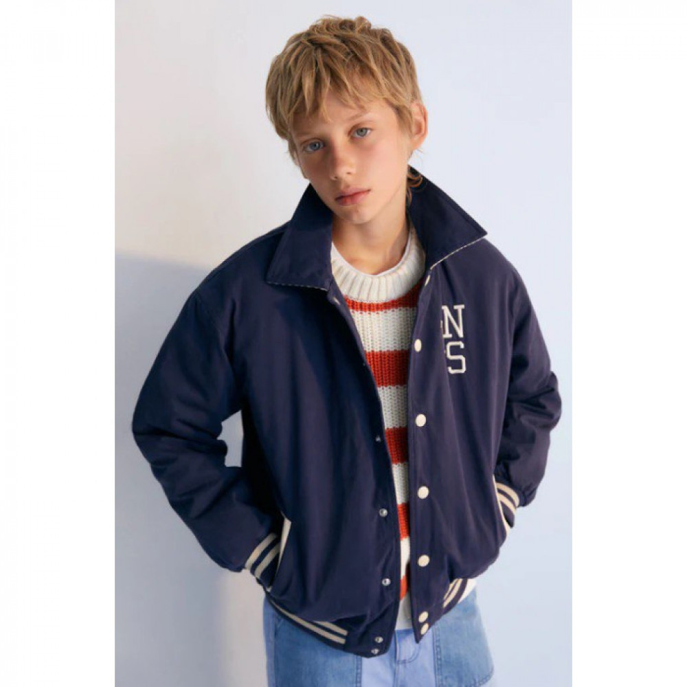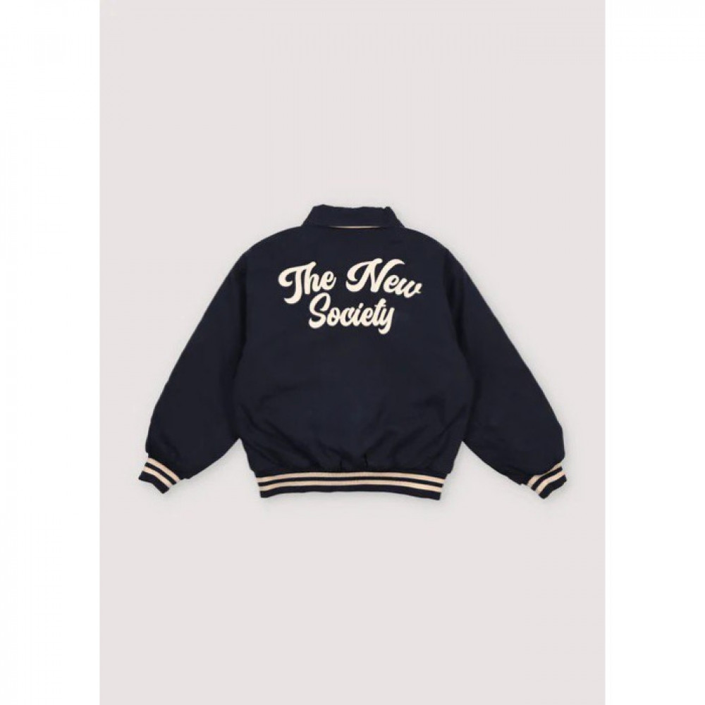 The Enyo Bomber is a standout jacket crafted in 100% cotton twill fabric in a deep navy color. Thoughtfully designed with contrasting macadamia details, it features practical pockets, ribbed cuffs, and a hem in navy and macadamia for a stylish finish. Signature 'TNS' embroideries on the front and 'the new society' on the back in macadamia add a bold, distinctive touch. Perfect for layering on cooler days, the Enyo Bomber combines comfort, style, and versatility, making it an essential piece for any boy’s wardrobe! Colo Collection: Navy Made in Portugal