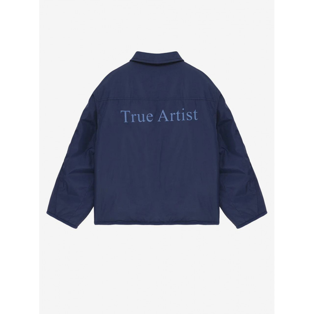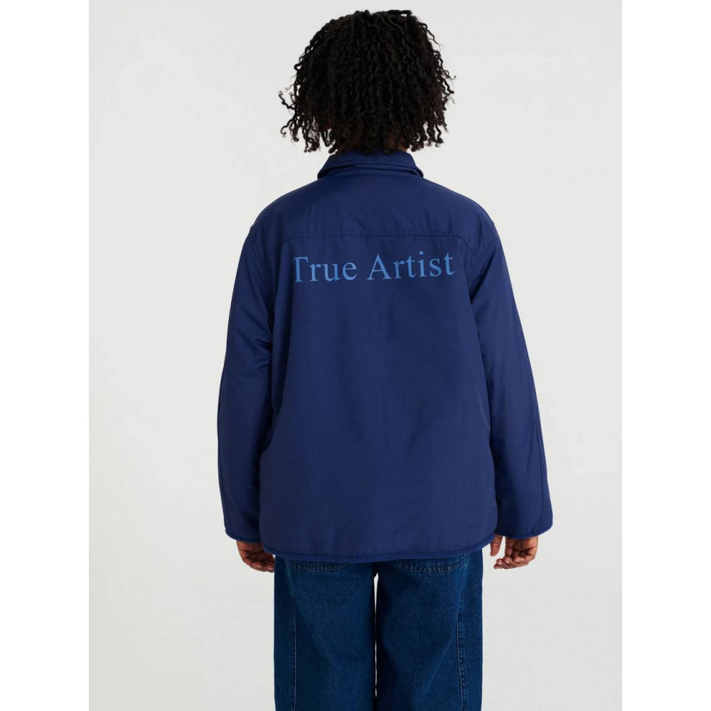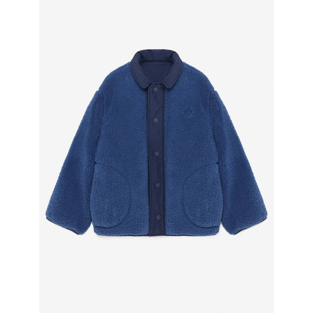 Reversible Jacket nº02 in Blueprint is made of 100% Polyamide in one face and 100% Polyester polar fleece on the other face. This reversible style features different details and colors on both sides: our logo printed at the back on the solid navy side and our bird logo embroidered on the chest on the lighter blue polar fleece side. It is designed with spread collar, front snaps fastening and dropped shoulders. It has a relaxed fit.