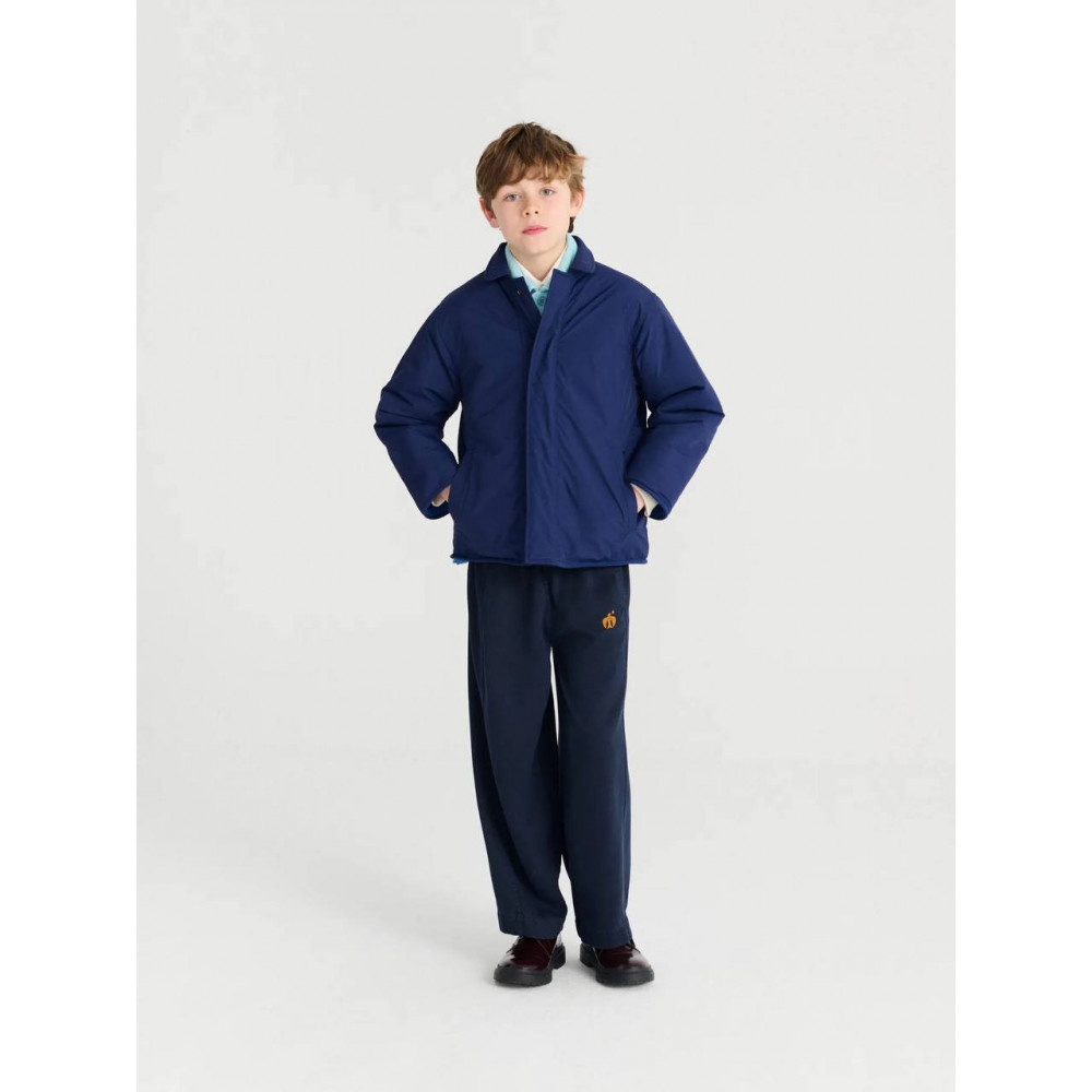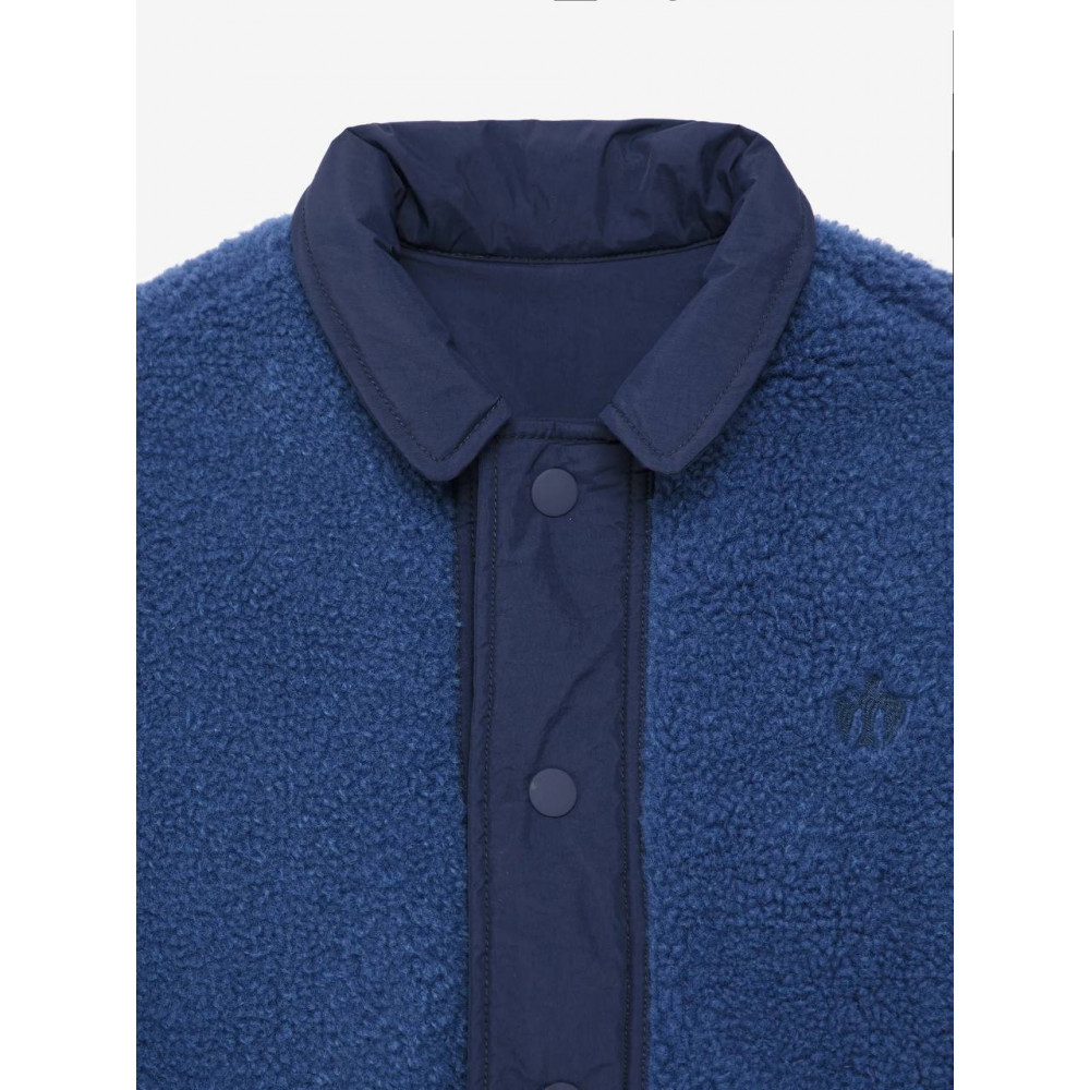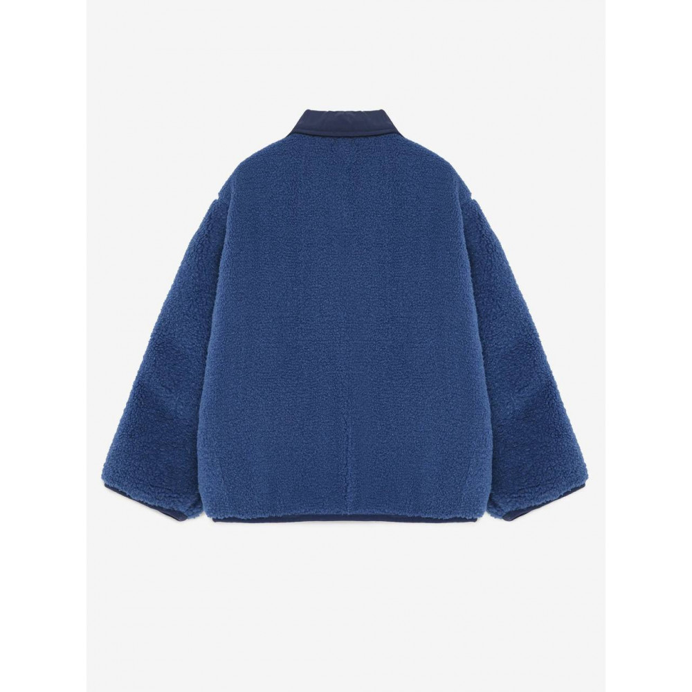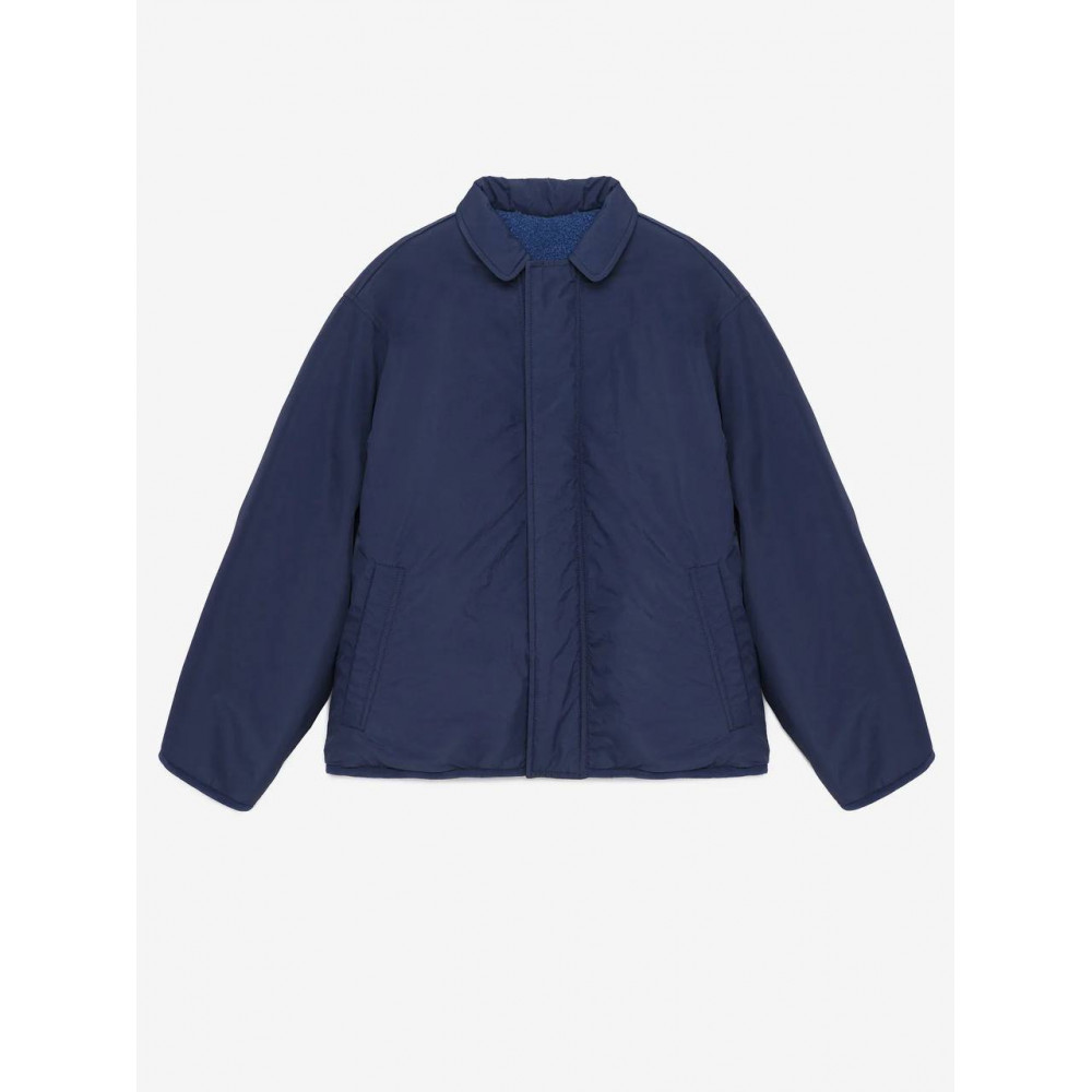 Reversible Jacket nº02 in Blueprint is made of 100% Polyamide in one face and 100% Polyester polar fleece on the other face. This reversible style features different details and colors on both sides: our logo printed at the back on the solid navy side and our bird logo embroidered on the chest on the lighter blue polar fleece side. It is designed with spread collar, front snaps fastening and dropped shoulders. It has a relaxed fit.