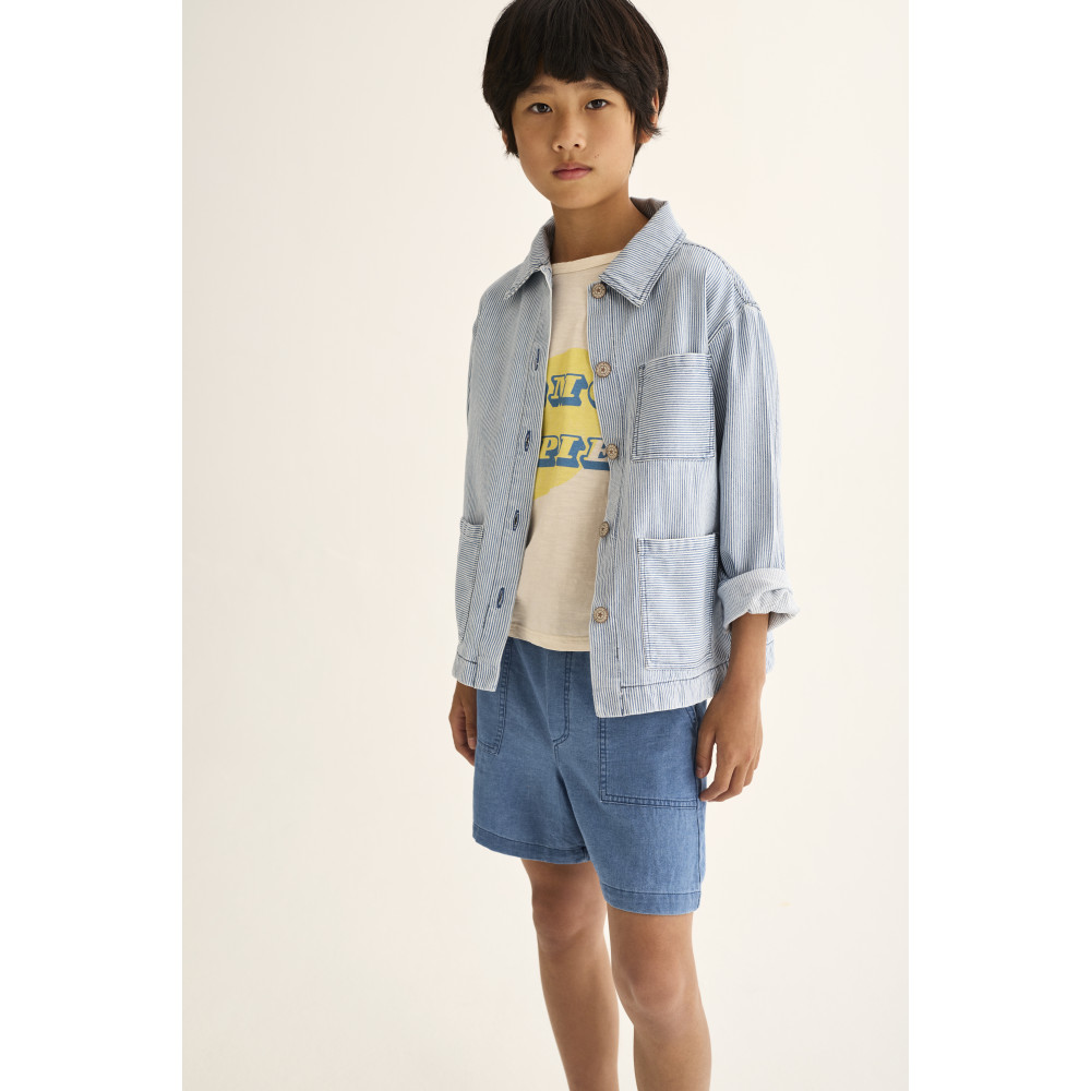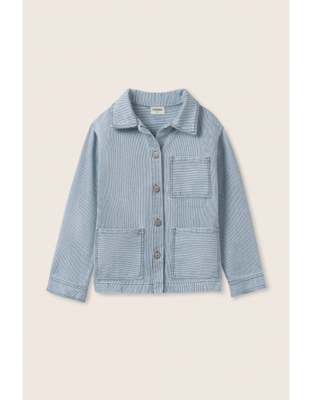 Striped denim-style jacket. Collared neckline and front closure with denim-style buttons. Three front pockets-chest and sides-with matching horizontal stripes. Cuffs in the same fabric. Lined back yoke with horizontal stripe placement.