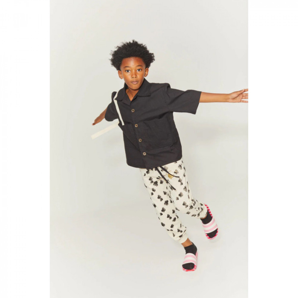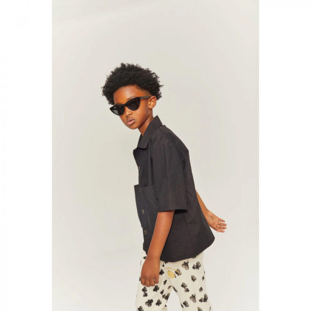 Designed for a touch of whimsical humor. Boasts button up front closure, pointed collar and two front pockets. A white strap detail from front to back on one side, passing the hem in the back. Exudes a fun and lighthearted charm.