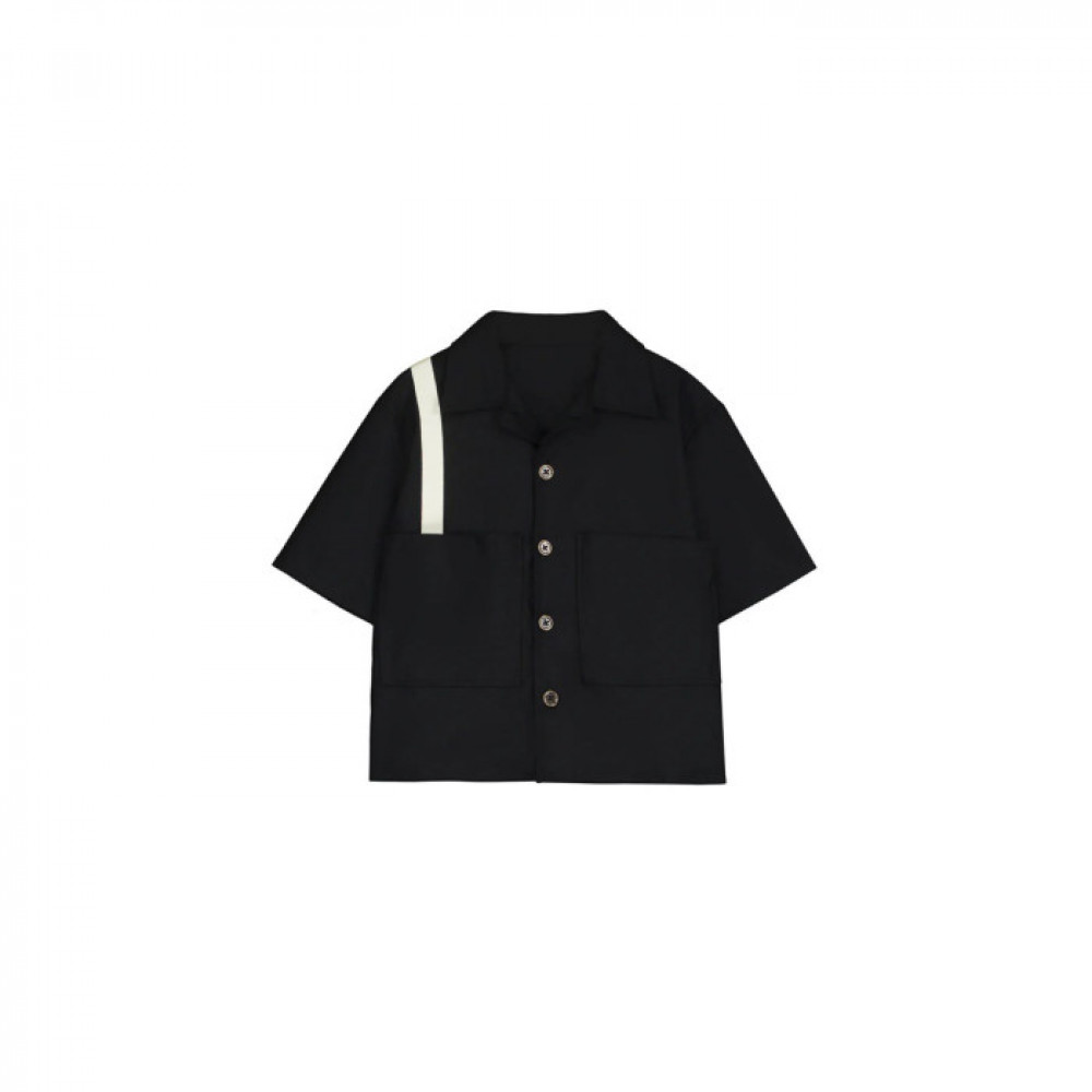 Designed for a touch of whimsical humor. Boasts button up front closure, pointed collar and two front pockets. A white strap detail from front to back on one side, passing the hem in the back. Exudes a fun and lighthearted charm.