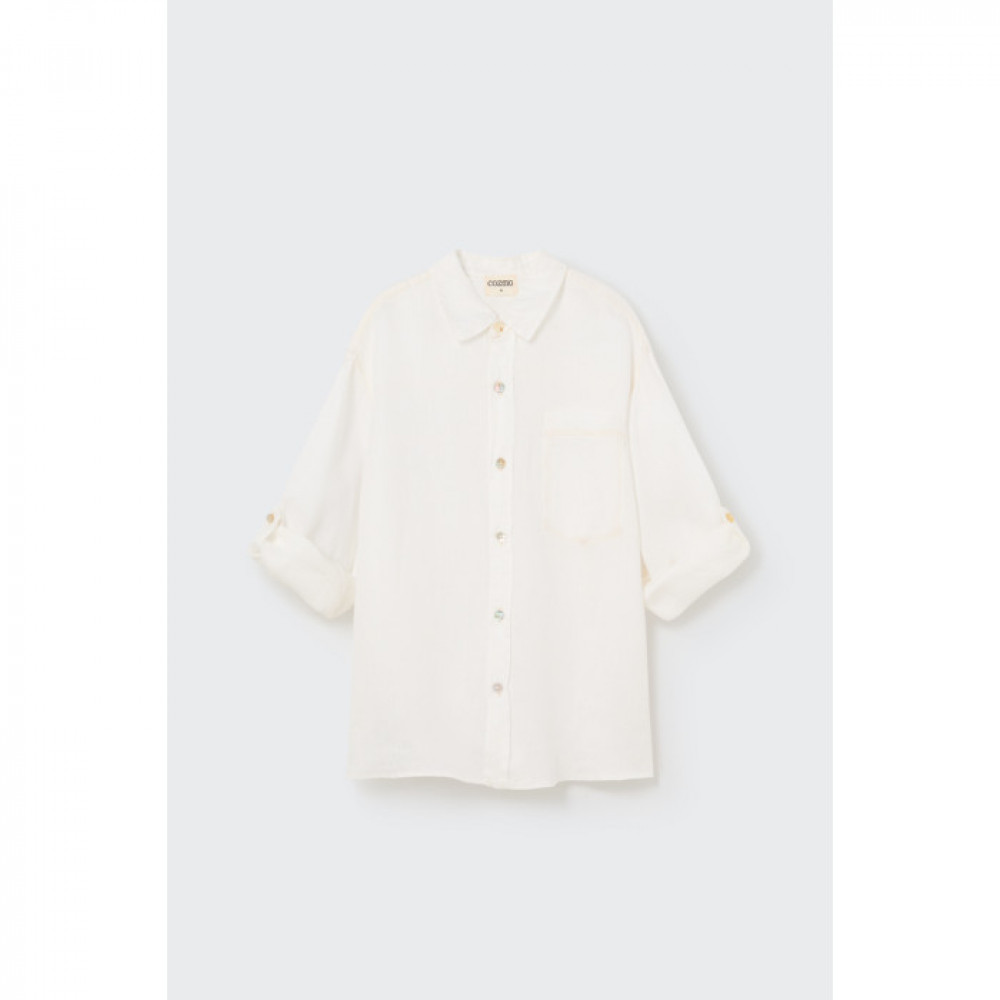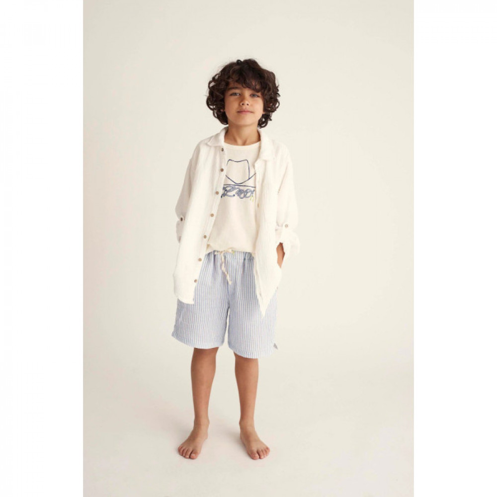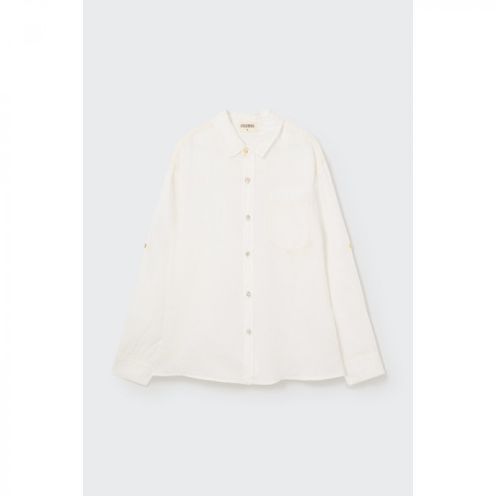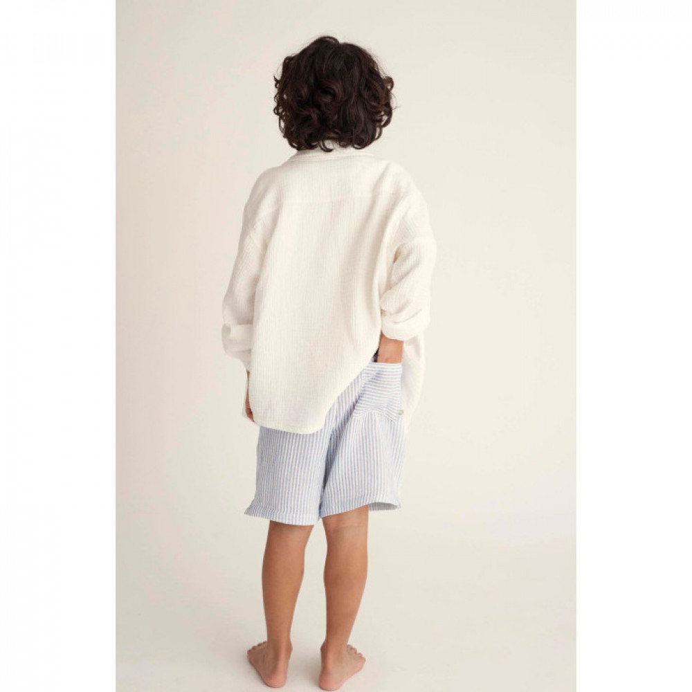 Shirt for boys in fluffy, light cotton gauze. Collar and button placket at front. Long roll-tab sleeves. Patch pocket at chest. Yoke at the back. Naturally wrinkled texture. Non-iron fabric.